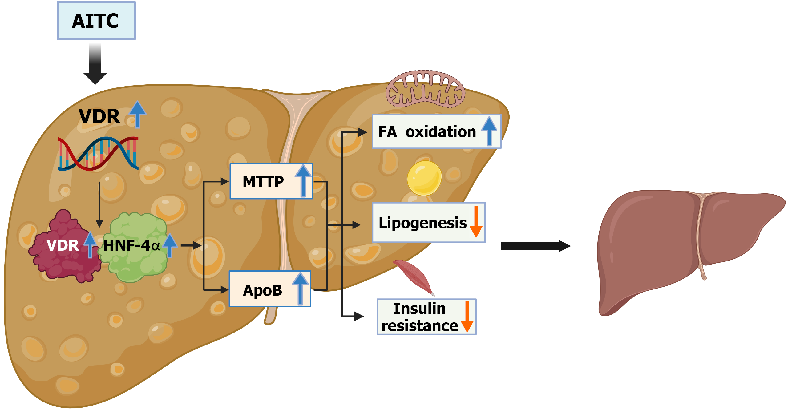 Allyl isothiocyanate activates vitamin D receptor to activate the hepatocyte nuclear factor 4 alpha/microsomal triglyceride transfer protein/apolipoprotein B signaling pathway, inhibits lipogenesis, promotes fatty acid β-oxidation, and improves insulin resistance, alleviating metabolic dysfunction-associated steatotic liver disease. AITC: Allyl isothiocyanate; HNF-4α: Hepatocyte nuclear factor 4 alpha; FA: Fatty acid; VDR: Vitamin D receptor; MTTP: Microsomal triglyceride transfer protein; ApoB: Apolipoprotein B.