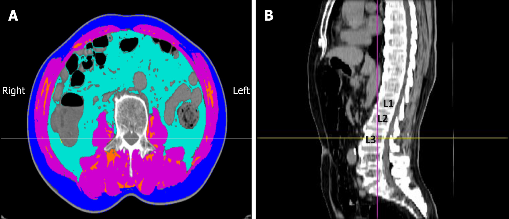 A: Axial computed tomography (CT) image showing the segmentation of different tissue compartments: Skeletal muscle area (SMA) [pink, -29 to +150 Hounsfield units (HU)], visceral adipose tissue area (light blue, -150 to -50 HU), subcutaneous adipose tissue area (dark blue, -190 to -30 HU), and intermuscular adipose tissue area (orange, -190 to -30 HU); B: Sagittal CT image indicating the L3 level for axial analysis. The skeletal muscle index was calculated as the SMA divided by the square of the patient’s height (SMA/height2).