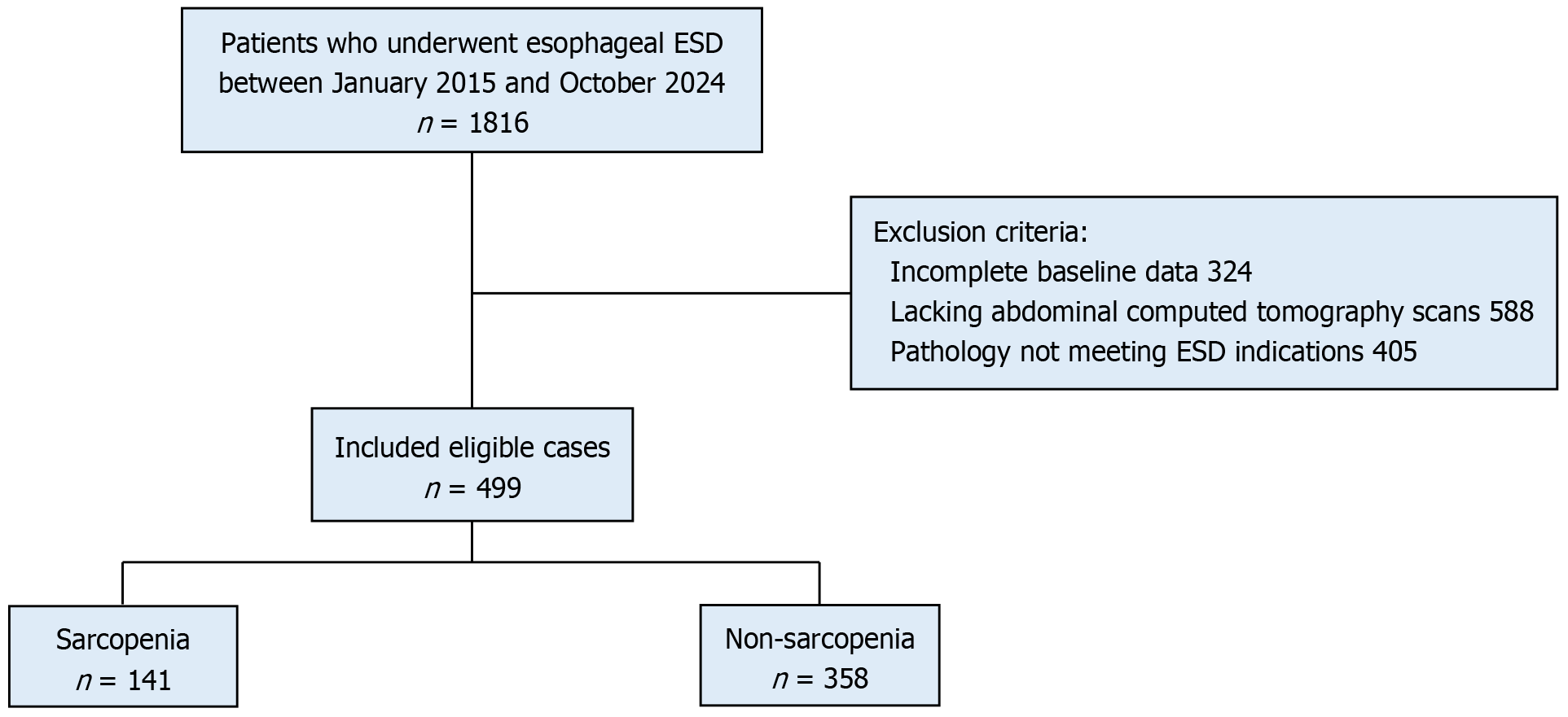 - Citation: Yang KZ, Chen L, Xu L, Xu BX, Li MY, Wang Z, Lu Q. Correlation between sarcopenia and esophageal stenosis following endoscopic submucosal dissection and construction of a postoperative stenosis risk model. World J Gastroenterol 2026; 32(5): 114752