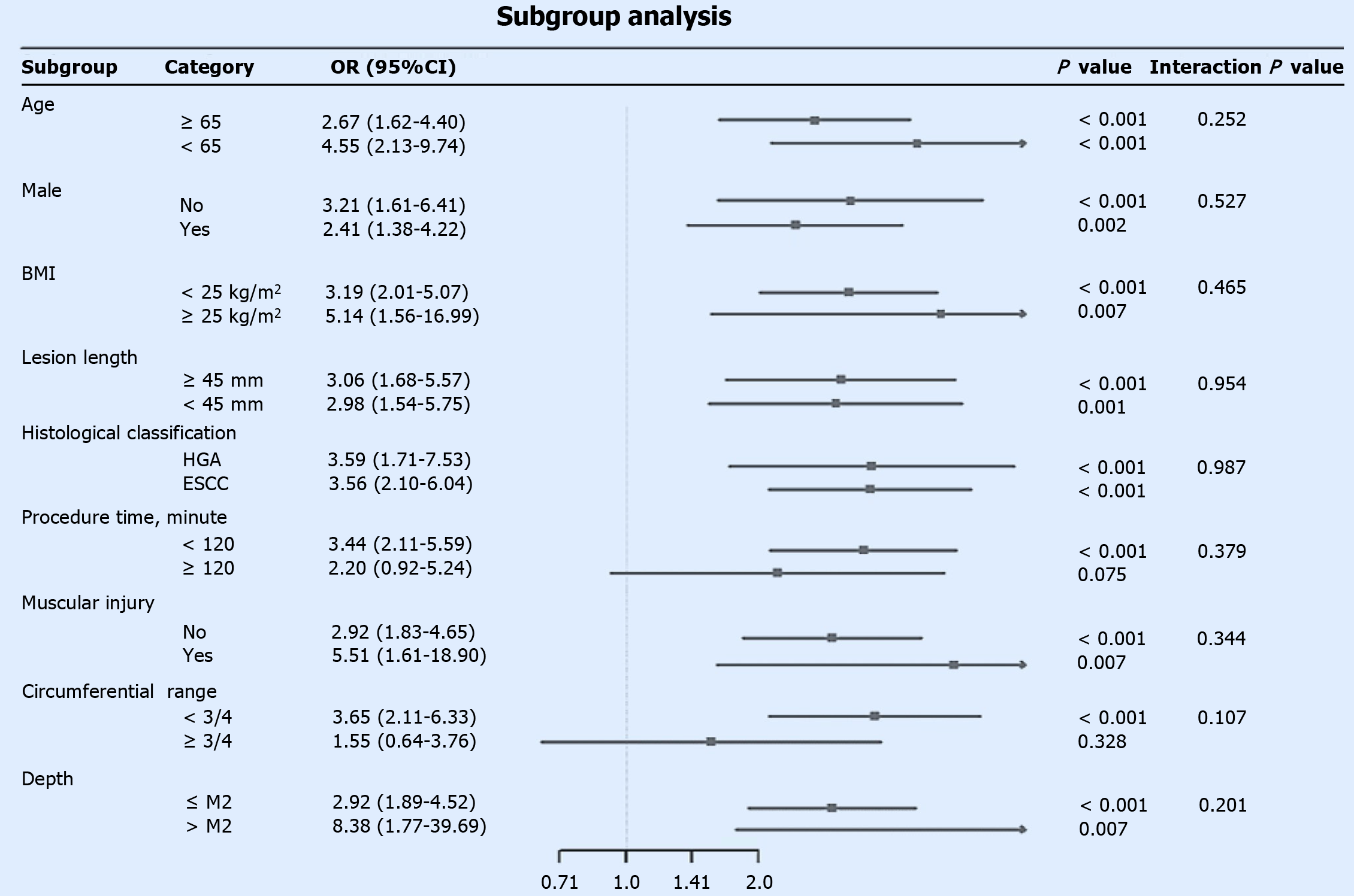 This forest plot displays the odds ratios (ORs) and 95% confidence intervals for the associations across various patient subgroups. An OR greater than 1 indicates a higher risk of stenosis in the sarcopenia group. The 'Interaction P' value tests whether the effect of sarcopenia on stenosis risk differs significantly between the subgroups. Circumferential: Circumferential resection range; ≤ M2: Invasion depth limited to the lamina propria mucosae or shallower; > M2: Invasion depth beyond the lamina propria mucosae. OR: Odds ratio; BMI: Body mass index; HGA: High-grade adenoma; ESCC: Esophageal squamous cell carcinoma.