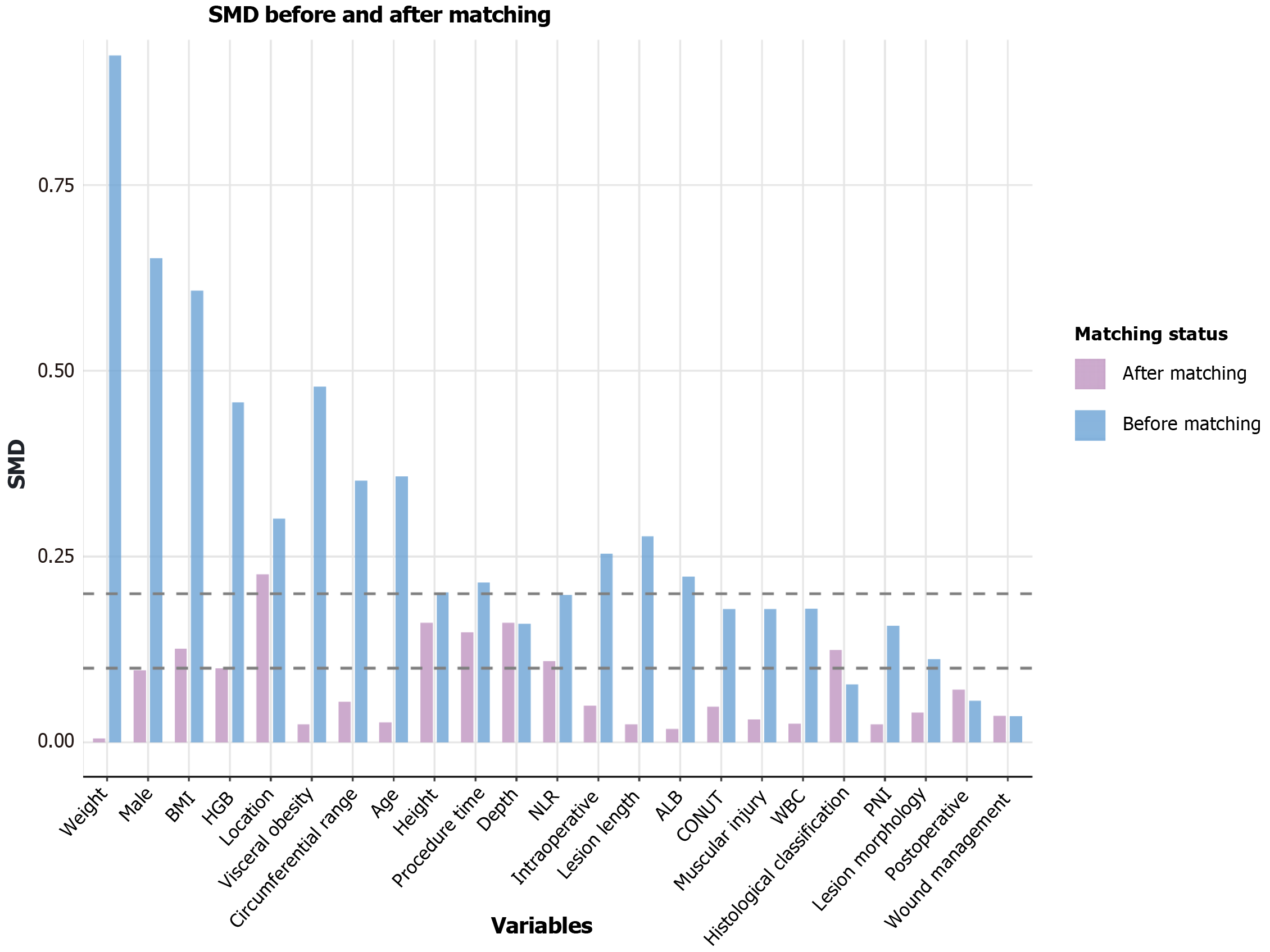 The plot compares the standardized mean differences (SMDs) of the baseline variables before and after propensity score matching (caliper = 0.2). The results demonstrate that matching effectively improved the balance between the patient groups, as most post-matching SMDs fell below the 01 threshold. SMD: Standardized mean difference; BMI: Body mass index; CONUT: Controlling Nutritional Status score; PNI: Prognostic Nutritional Index; NLR: Neutrophil-to-lymphocyte ratio; WBC: White blood cell count; HGB: Hemoglobin concentration; ALB: Serum albumin concentration.