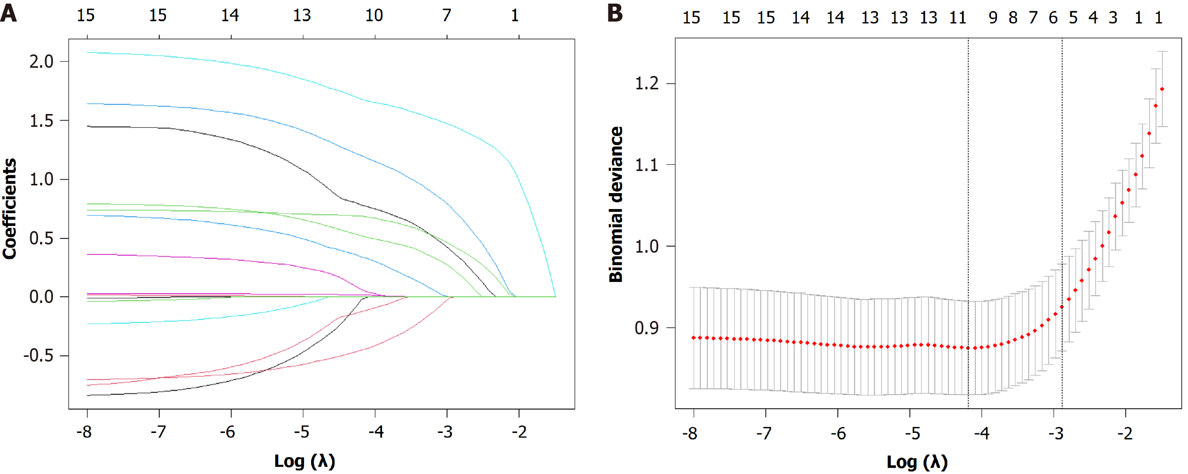 A: The least absolute shrinkage and selection operator coefficient profile plot shows the trajectory of each variable's coefficient as the penalty parameter (lambda) increases. Each colored line represents a variable; B: The 10-fold cross-validation plot for tuning parameter (lambda) selection. The left vertical dashed line indicates the lambda value at which the model achieves minimum binomial deviance (λ.min), whereas the right dashed line represents the most regularized model within one standard error of the minimum (λ.1 se). The final predictors were selected at the λ.1 se value to obtain a more parsimonious model.