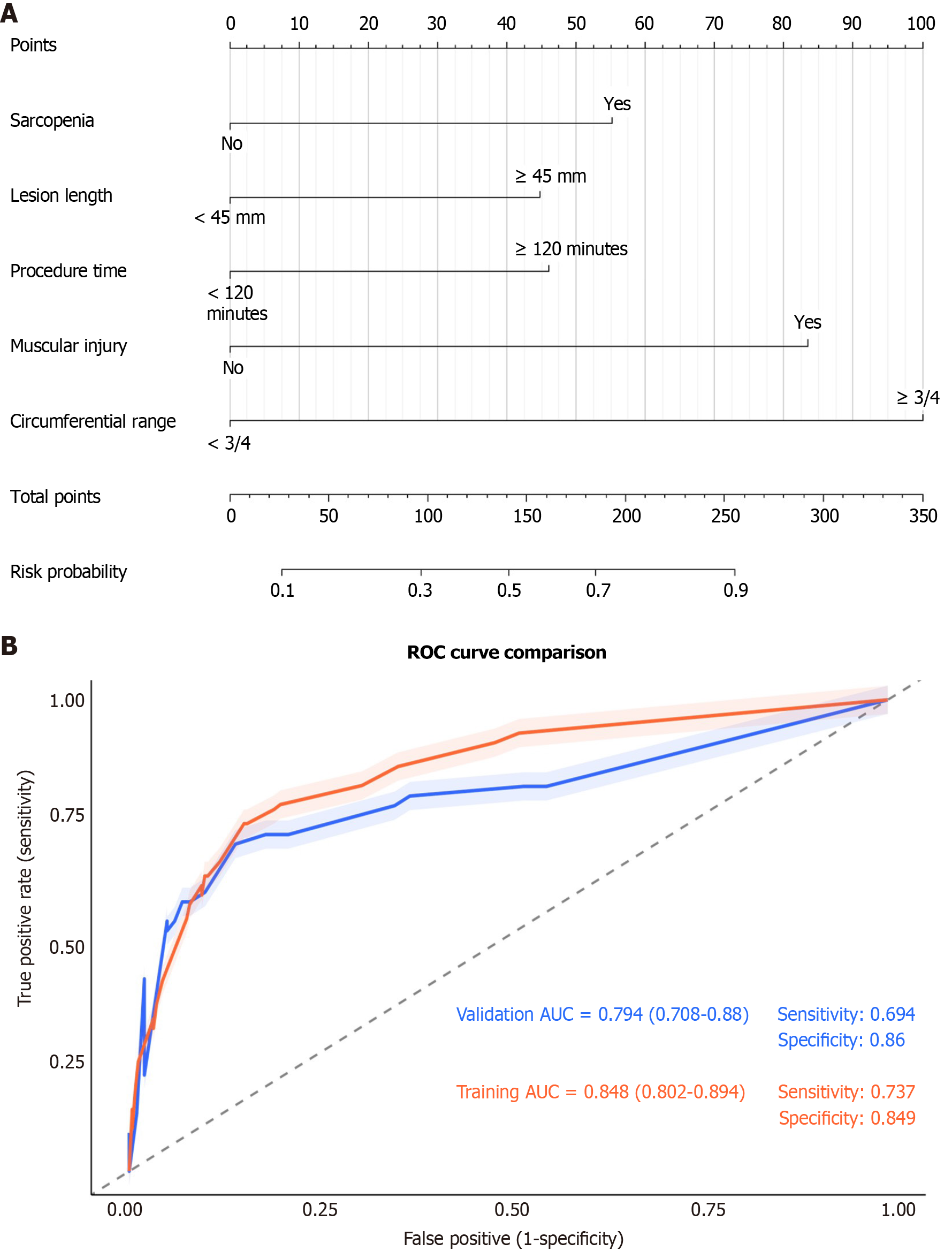 A: The nomogram is used to calculate an individual patient's risk of postoperative stenosis. For each predictor (including sarcopenia, lesion length, procedure time, and circumferential range), a vertical line is drawn upward to the 'Points' axis to determine the corresponding score. The sum of these scores is located on the 'Total Points' axis, and a line drawn downward to the 'Risk Probability' axis indicates the personalized stenosis risk; B: Receiver operating characteristic curves demonstrate the discriminative ability of the model. The area under the curve was 0.848 (95% confidence interval: 0.802-0.894) in the training cohort and 0.794 (95% confidence interval: 0.708-0.88) in the validation cohort, indicating good and consistent predictive performance. ROC: Receiver operating characteristic; AUC: Area under the curve.