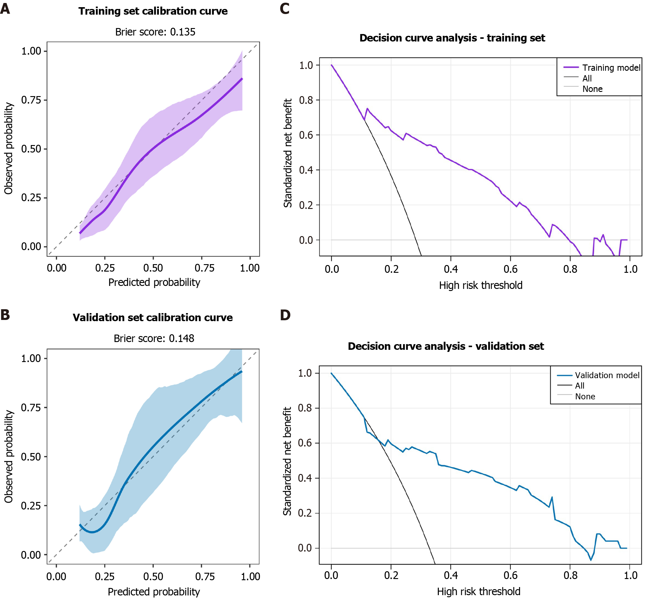 A and B: Calibration curves plot the predicted probability against the observed frequency of stenosis. The dashed diagonal line represents perfect calibration. The close fit of the solid line (our model) to the diagonal, along with low Brier scores (training: 0.135; validation: 0.148), indicates excellent agreement between predictions and actual outcomes; C and D: Decision curve analysis evaluates the clinical net benefit of the model across various threshold probabilities. The “prediction model” line shows that using the nomogram for clinical decision-making provides greater net benefit than the strategies of “treating all” or “treating none” of the patients across a wide range of risk thresholds do, demonstrating its potential clinical utility.