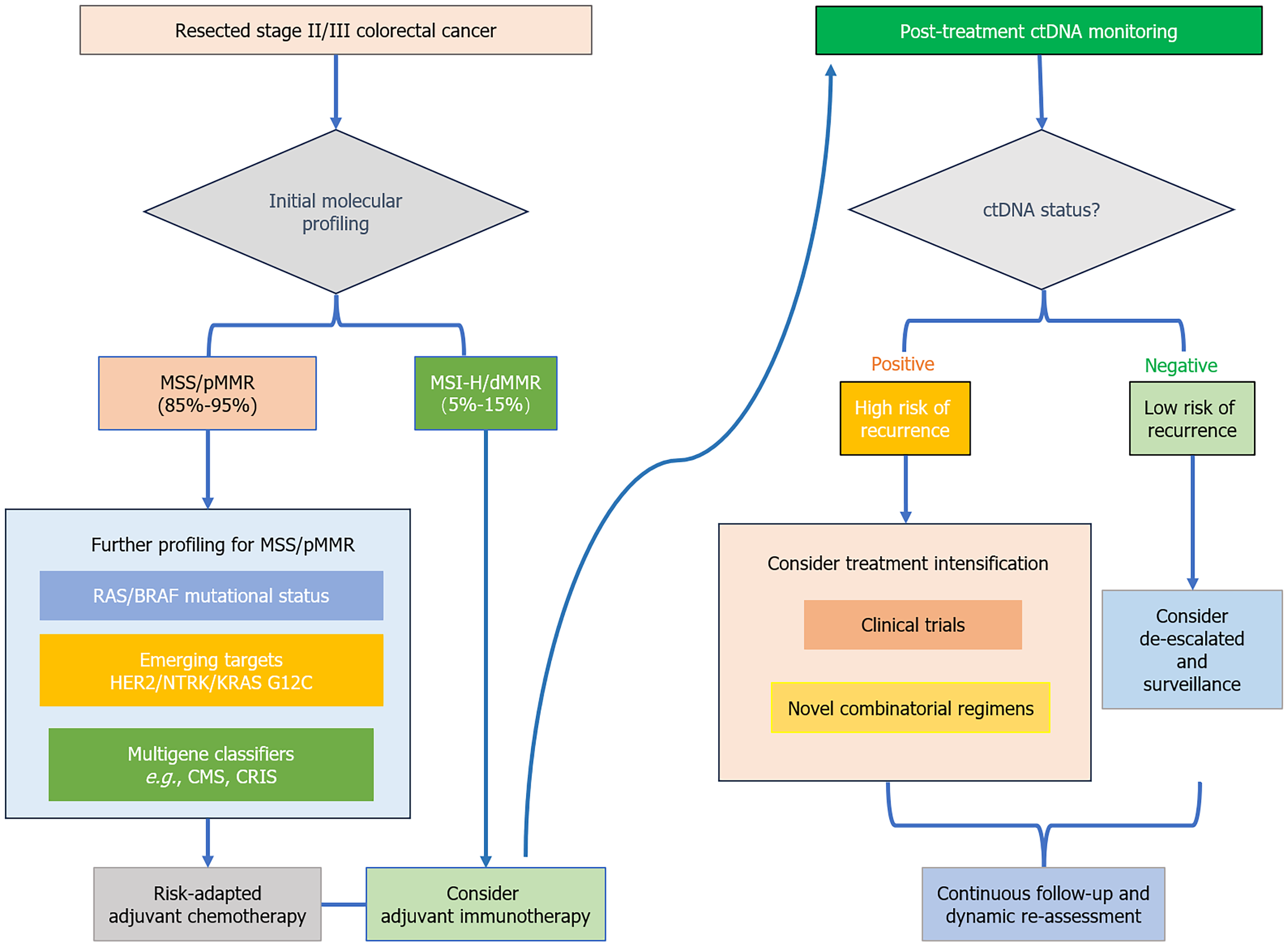 This algorithm illustrates the per sonalized management pathway following surgical resection. Initial molecular profiling by mismatch repair status segregates patients into microsatellite instability-high/mismatch repair deficient (representing a candidate for clinical trials evaluating adjuvant immunotherapy) and microsatellite stability/proficient mismatch repair streams. For the majority microsatellite stability/proficient mismatch repair cohort, further profiling (e.g., rat sarcoma viral oncogene homolog/B-rapidly accelerated fibrosarcoma, multigene classifiers) informs risk-adapted chemotherapy. For all patients, post-treatment circulating tumor DNA (ctDNA) monitoring dynamically stratifies recurrence risk, guiding subsequent decisions on treatment intensification (for ctDNA-positive) or de-escalated surveillance (for ctDNA-negative). MSS: Microsatellite stability; pMMR: Proficient mismatch repair; MSI-H: Microsatellite instability-high; dMMR: Mismatch repair deficient; RAS: Rat sarcoma viral oncogene homolog; BRAF: B-rapidly accelerated fibrosarcoma; HER2: Human epidermal growth factor receptor 2; NTRK: Neurotrophic tyrosine receptor kinase; KRAS: Kirsten rat sarcoma viral oncogene homolog; CMS: Consensus molecular subtype; CRIS: Colorectal cancer intrinsic subtype; ctDNA: Circulating tumor DNA.