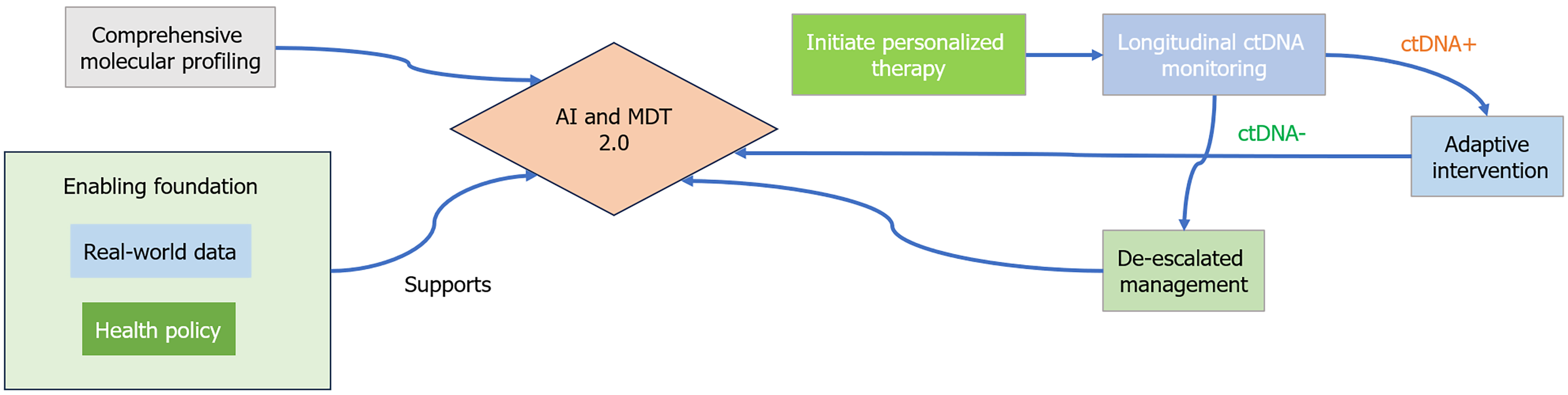 This model integrates tiered molecular pro filing at diagnosis (ranging from core biomarker testing to comprehensive multi-omics based on resource availability) with adaptable longitudinal circulating tumor DNA (ctDNA) monitoring (with cadences adjustable to local capacities) to guide personalized therapy. The entire process is supported by an enabling foundation of real-world data and health policy, and driven by artificial intelligence and MDT 2.0 for collaborative decision-making. The system enables adaptive intervention for ctDNA-positive (minimal residual disease) patients or de-escalated management for ctDNA-negative patients, facilitating a continuous cycle of personalized care. The framework is designed to be implemented across a spectrum of resource settings through prioritized testing, tiered algorithms, and flexible monitoring cadences, ensuring practicality in diverse healthcare environments from high-resource centers to resource-constrained clinics. AI: Artificial intelligence; ctDNA: Circulating tumor DNA.