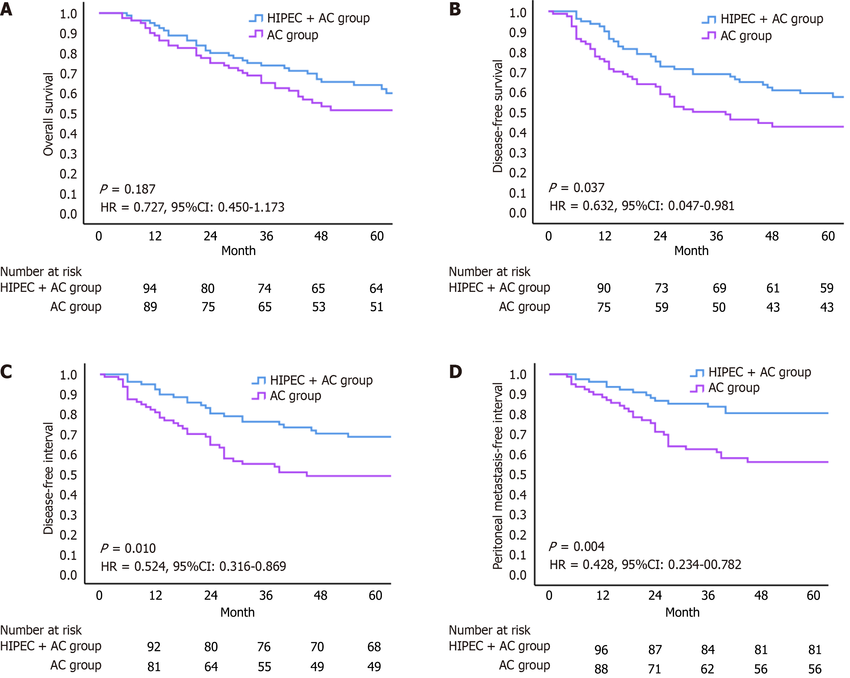 A: Overall survival; B: Disease-free survival; C: Disease-free interval; D: Peritoneal metastases-free interval. AC: Adjuvant chemotherapy; HIPEC: Hyperthermic intraperitoneal chemotherapy; HR: Hazard ratio.
