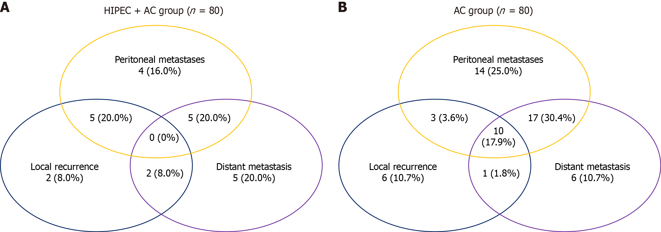A: Hyperthermic intraperitoneal chemotherapy + adjuvant chemotherapy group; B: Adjuvant chemotherapy group. AC: Adjuvant chemotherapy; HIPEC: Hyperthermic intraperitoneal chemotherapy.