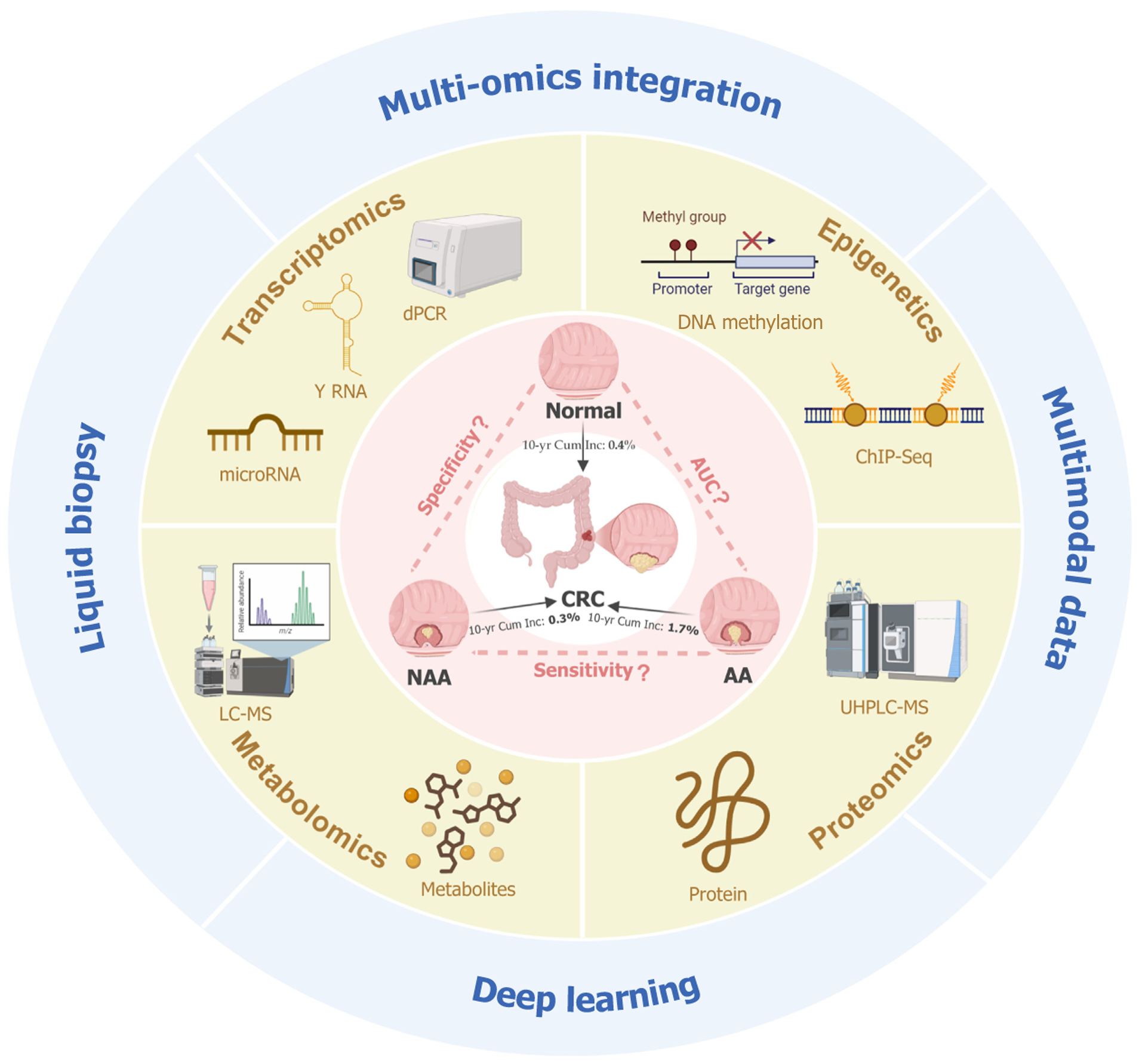 dPCR: Digital polymerase chain reaction; LC-MS: Liquid chromatography-mass spectrometry; UHPLC-MS: Ultra-high performance liquid chromatography-mass spectrometry; CRC: Colorectal cancer; NAA: Non-advanced adenomas; AA: Advanced adenomas; 10-yr Cum Inc: 10-year cumulative incidence.