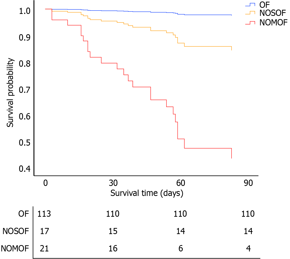 After adjusting for age, sex, Bedside Index of Severity in Acute Pancreatitis score, computed tomography severity index score, infected pancreatic necrosis, open pancreatic necrosectomy, major complications, multiple organ failure on admission, organ failure duration > 2 weeks, new-onset single organ failure (hazard ratio = 6.8, 95% confidence interval: 1.4-33.5, P = 0.019), and new-onset multi-organ failure (hazard ratio = 33.2, 95% confidence interval: 9.4-117.3, P < 0.001) were significantly associated with 90-day mortality in severe acute pancreatitis patients. OF: Organ failure; NOSOF: New-onset single organ failure; NOMOF: New-onset multi-organ failure.