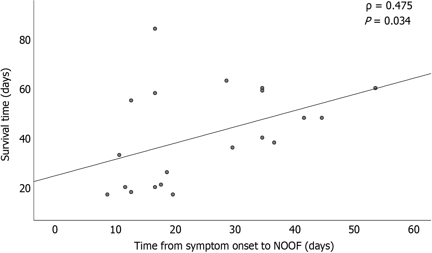 Figure 5 A positive correlation between new-onset organ failure onset time and 90-day survival by Spearman’s correlation analysis.