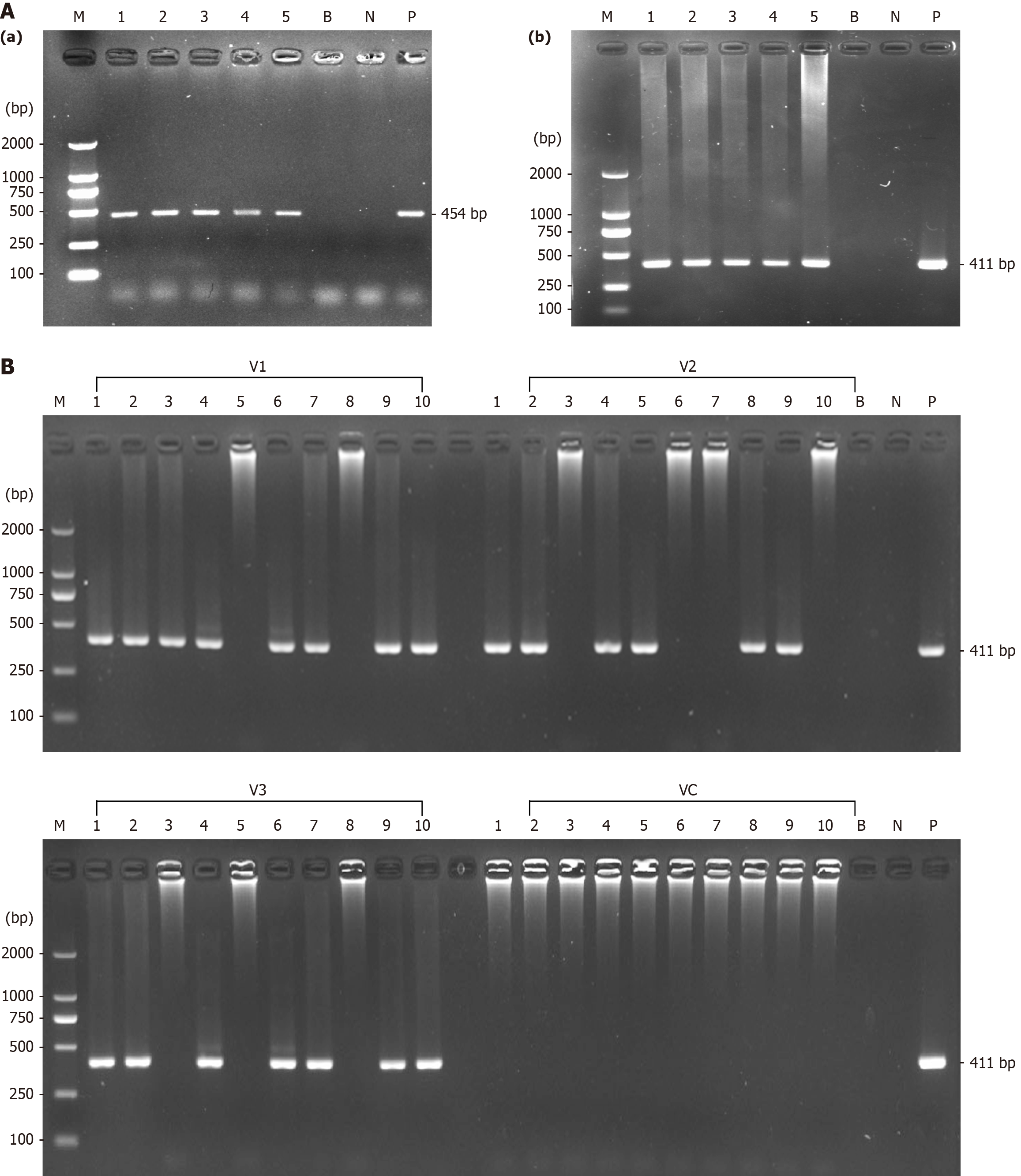 A: Identification of the strains used for modeling. a: Helicobacter pylori (H. pylori) 16S rDNA; b: H. pylori ureA gene; lane M: DL2000 marker; lane 1: Candida W49; lane 2: Candida F67; lane 3: Candida Ca-co-Hp; lane 4: Candida J115; lane 5: Candida H100; lane B: Blank control (ddH2O); lane N: Negative control (Ca10231); lane P: Positive control (H. pylori). Candida strains J115, H100, W49, F67, and Ca-co-Hp tested positive for H. pylori 16S rDNA and ureA genes, whereas the Ca10231 strain tested negative; B: Identification of H. pylori ureA gene in vaginal Candida isolates obtained from maternal mice. Lane M: DL2000 marker; lanes 1-10: Ten mice in each group; lane B: Blank control (ddH2O); lane N: Negative control (Ca10231); lane P: Positive control (H. pylori). Groups V1-V3 mice intravaginally inoculated with J115, H100, or Ca-co-Hp. Group VC was intravaginally inoculated with Ca10231. Group VN received saline solution.