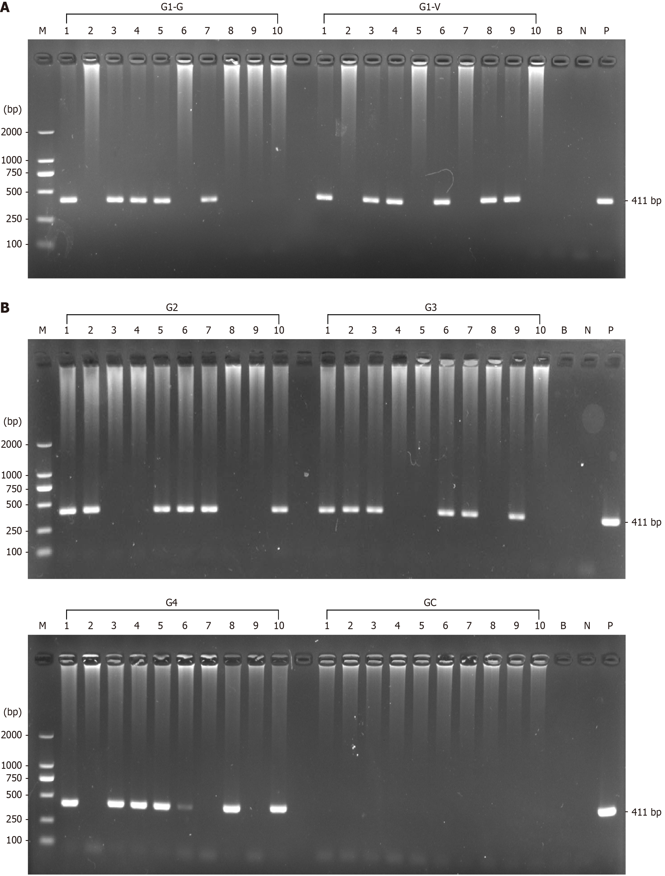 A: Fecal and vaginal Candida isolated from group G1 mice; B: Fecal Candida isolated from group G2, G3, G4, and GN mice. Lane M: DL2000 marker; lanes 1-10: The 10 mice in each group; lane B: Blank control (ddH2O); lane N: Negative control (Ca10231); lane P: Positive control (Helicobacter pylori). G1-G: Fecal Candida from group G1 mice. G1-V: Vaginal Candida from group G1 mice. Group G1 mice were infected with Helicobacter pylori via gavage and Candida Ca10231 was inoculated intravaginally. Mice in groups G2, G3, G4, and GC were infected with Candida strains W49, F67, Ca-co-Hp, and Ca10231 via gavage, respectively. Group GN mice received saline solution via gavage.