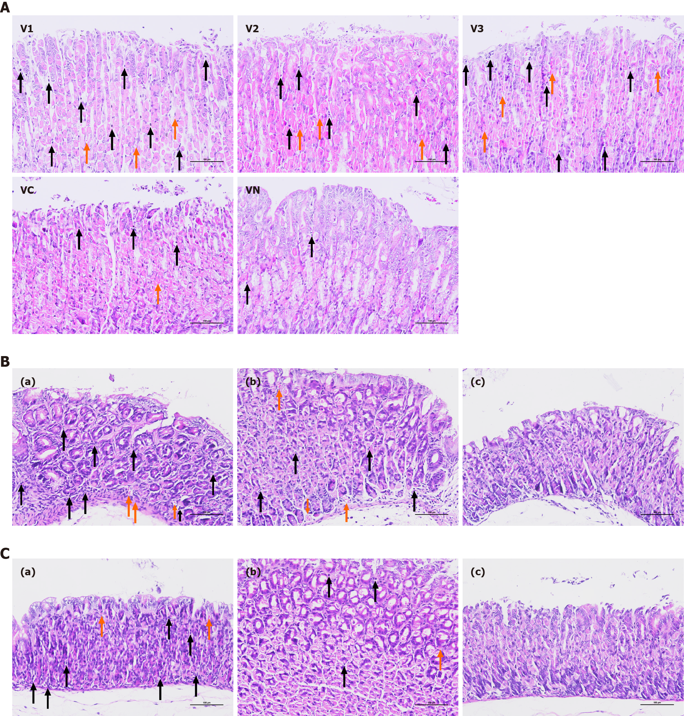 A: Maternal mice; B: Three-week-old offspring mice; C: Six-week-old offspring mice. a: Gastric mucosa from offspring mice in the experimental group; b: Gastric mucosa from offspring in the control group; c: Gastric mucosa from offspring in the normal group. V1: Vagina infected with Candida J115; V2: Vagina infected with Candida H100; V3: Vagina infected with Candida Ca-co-Hp; VC: Vagina infected with Candida Ca10231; VN: Vagina treated with saline solution. The orange and black arrows in the figure indicate the bleeding points and inflammatory cells, respectively.