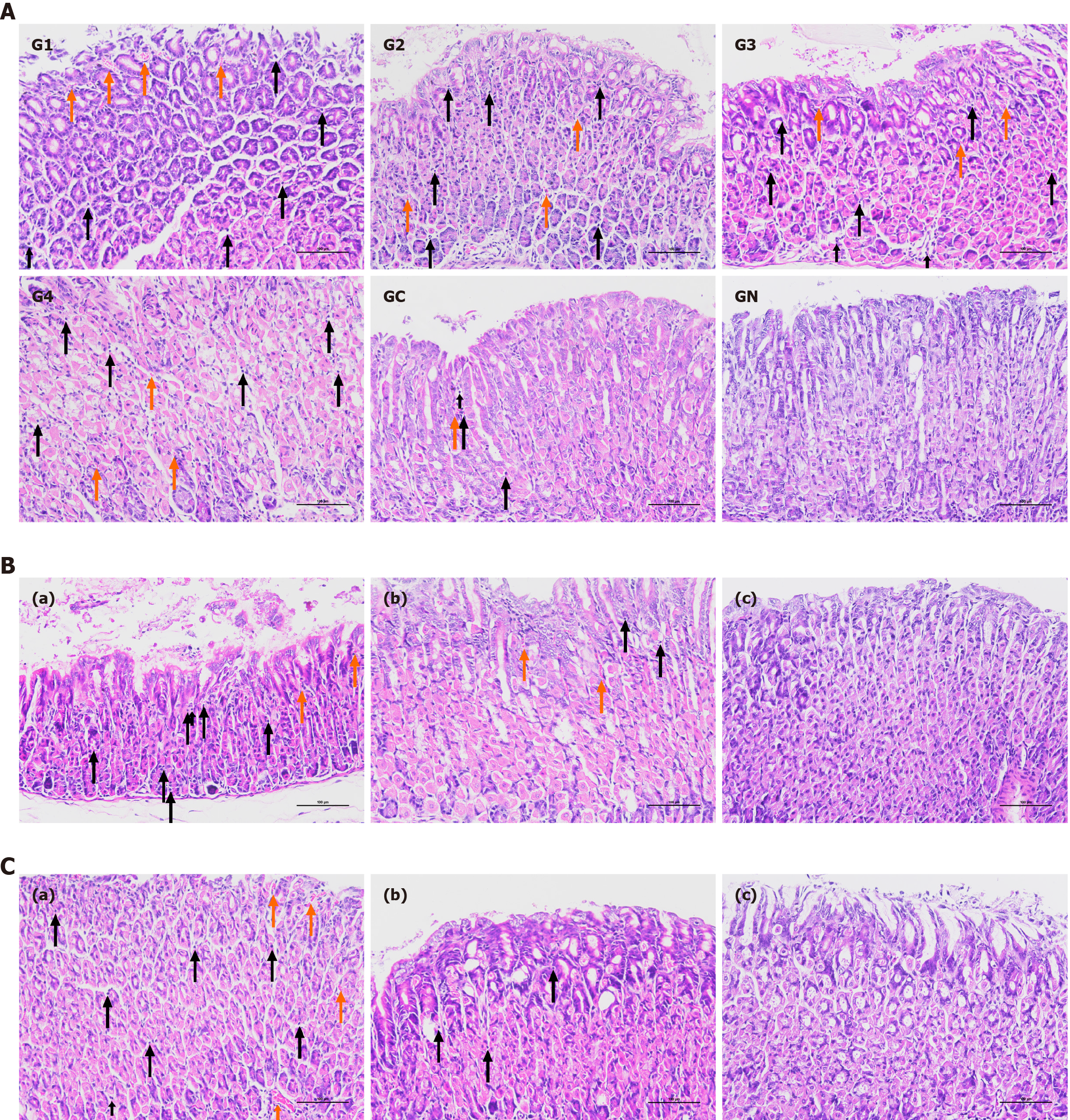A: Maternal mice; B: Three-week-old offspring mice; C: Six-week-old offspring mice. a: Gastric mucosa from offspring mice in the experimental group; b: Gastric mucosa from offspring in the control group; c: Gastric mucosa from offspring in the normal group. Group G1 mice were infected with Helicobacter pylori via gavage and inoculated intravaginally with Candida Ca10231; group G2 mice were gavaged with Candida W49; group G3 mice were gavaged with Candida F67; group G4 mice were gavaged with Candida Ca-co-Hp; group GC mice were gavaged with Candida Ca10231; and group GN mice were gavaged with saline solution. The orange and black arrows in the figure indicate bleeding points and inflammatory cells, respectively.