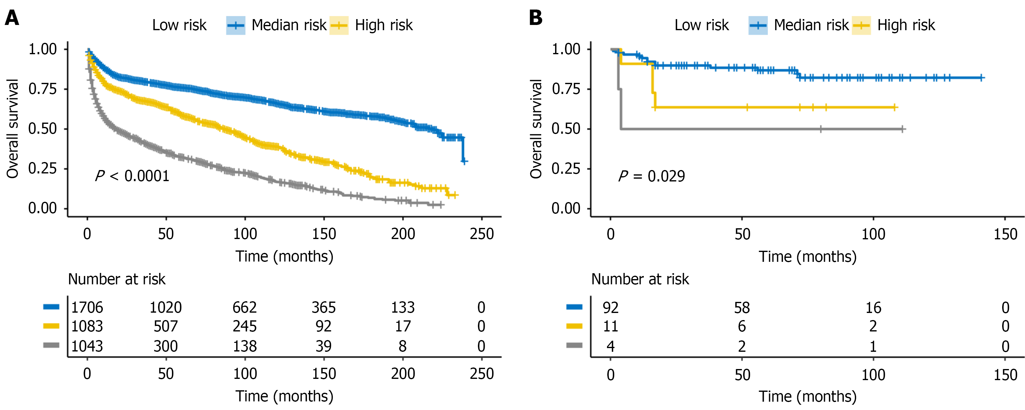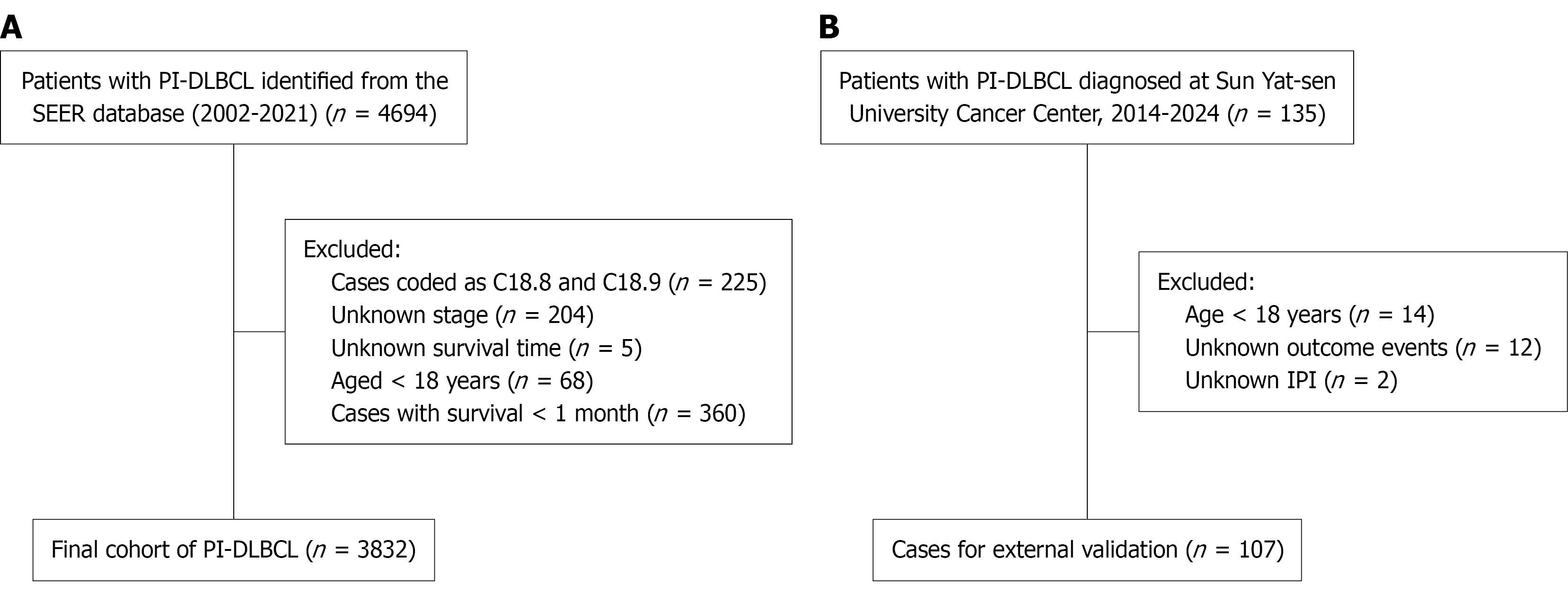 A: SEER training cohort; B: Sun Yat-sen University Cancer Center external validation cohort. PI: Primary intestinal; DLBCL: Diffuse large B-cell lymphoma; IPI: International prognostic index.