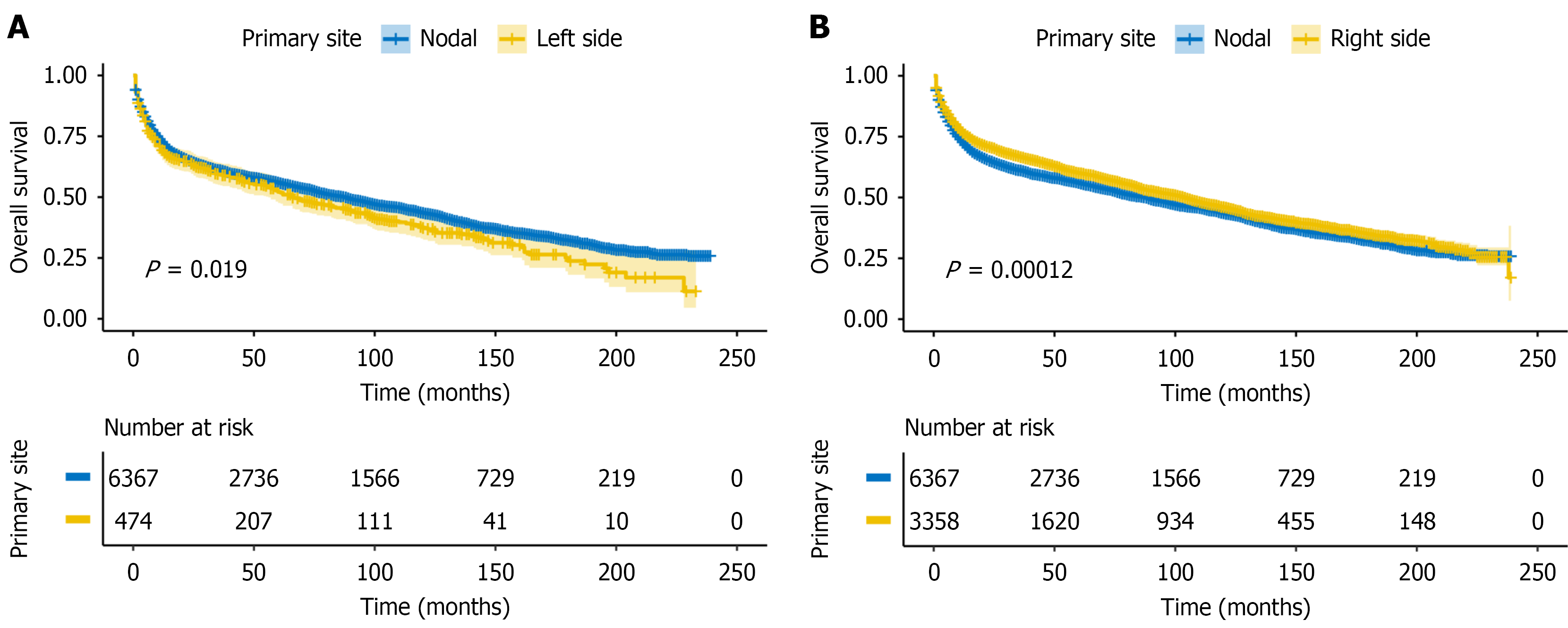 A: Left-sided primary intestinal (PI) diffuse large B-cell lymphoma (DLBCL) vs intra-abdominal nodal DLBCL (N-DLBCL); B: Right-sided PI-DLBCL vs intra-abdominal N-DLBCL.