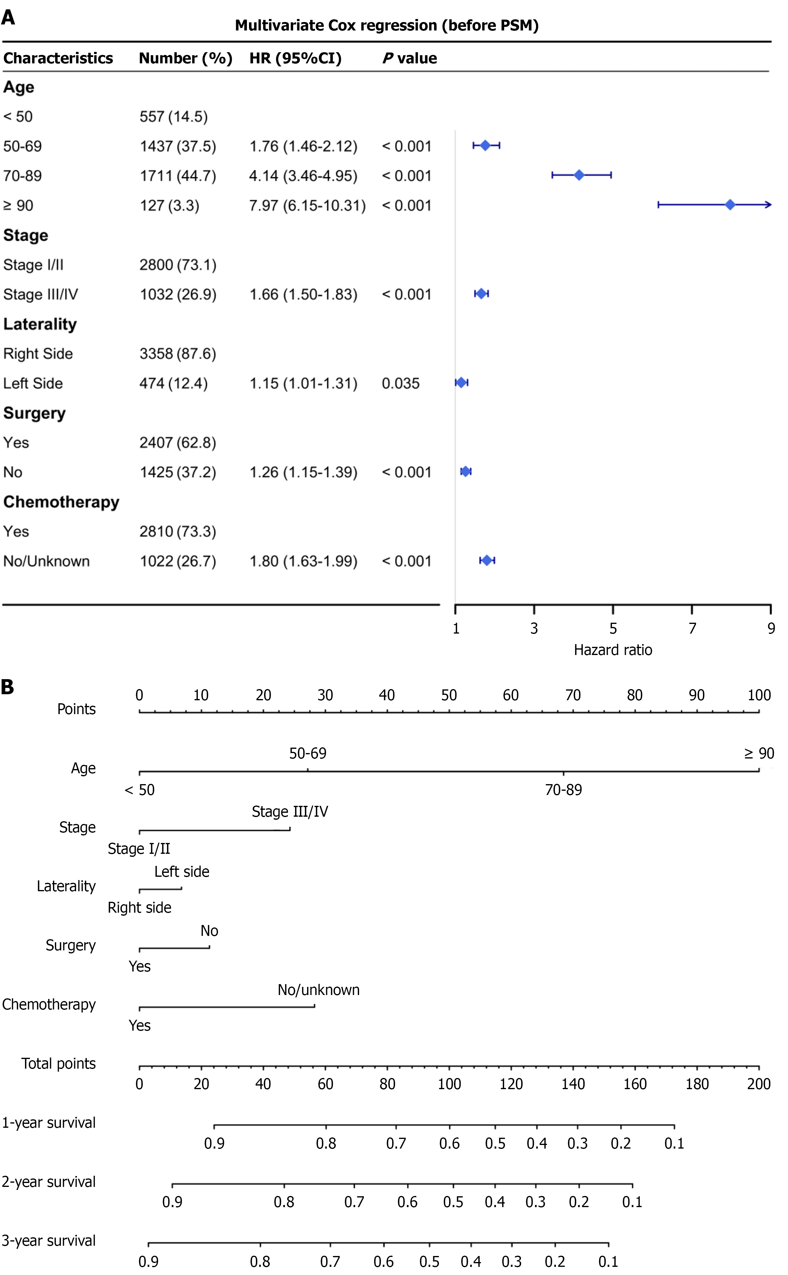 A: Forest plot; B: Nomogram predicting 1-, 2-, and 3-year overall survival. PSM: Propensity score matching; HR: Hazard ratio; CI: Confidence interval.