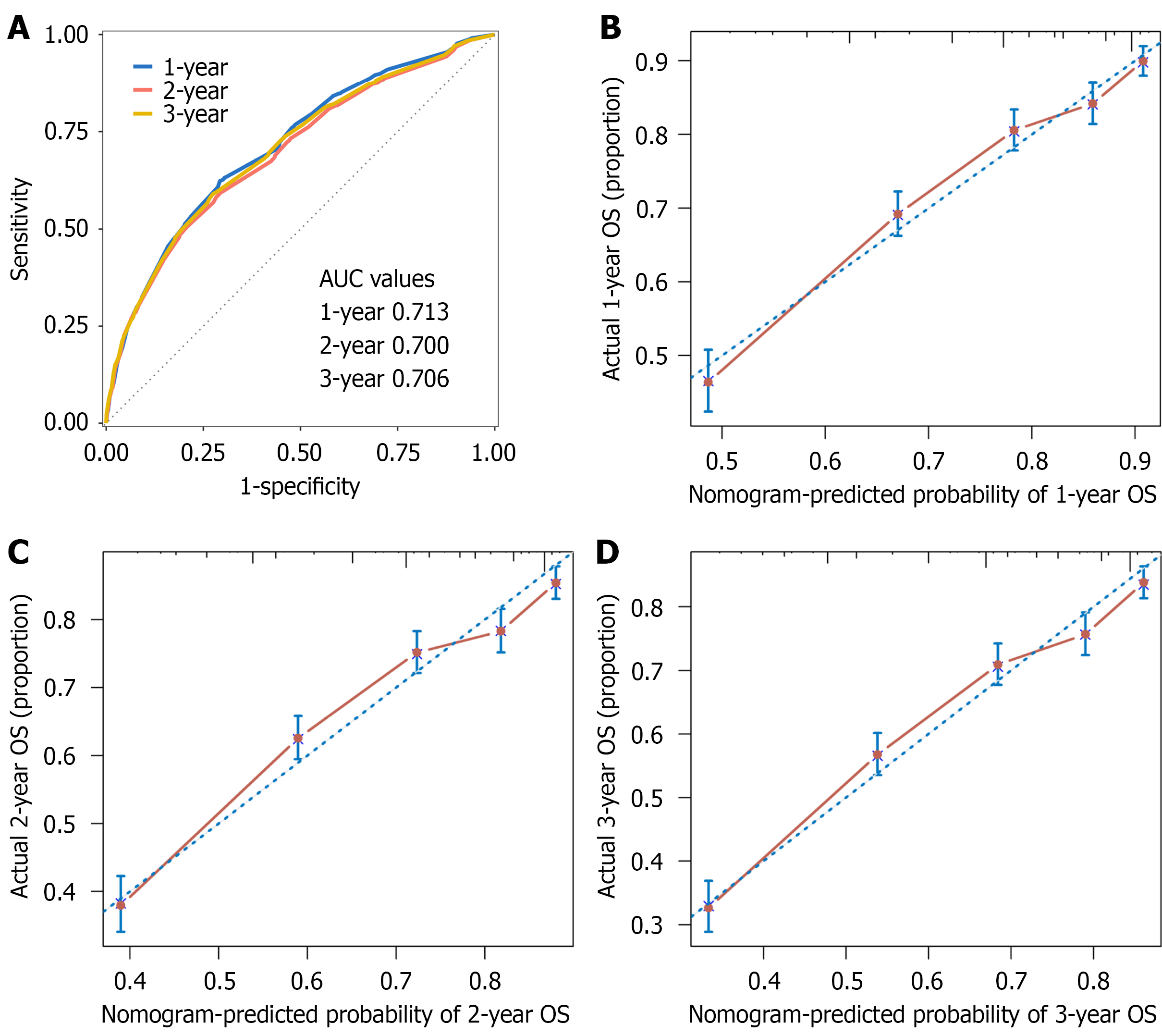 A: Time-dependent receiver operating characteristic curves (1-, 2-, 3-year); B: 1-year calibration; C: 2-year calibration; D: 3-year calibration. AUC: Area under the curve; OS: Overall survival.