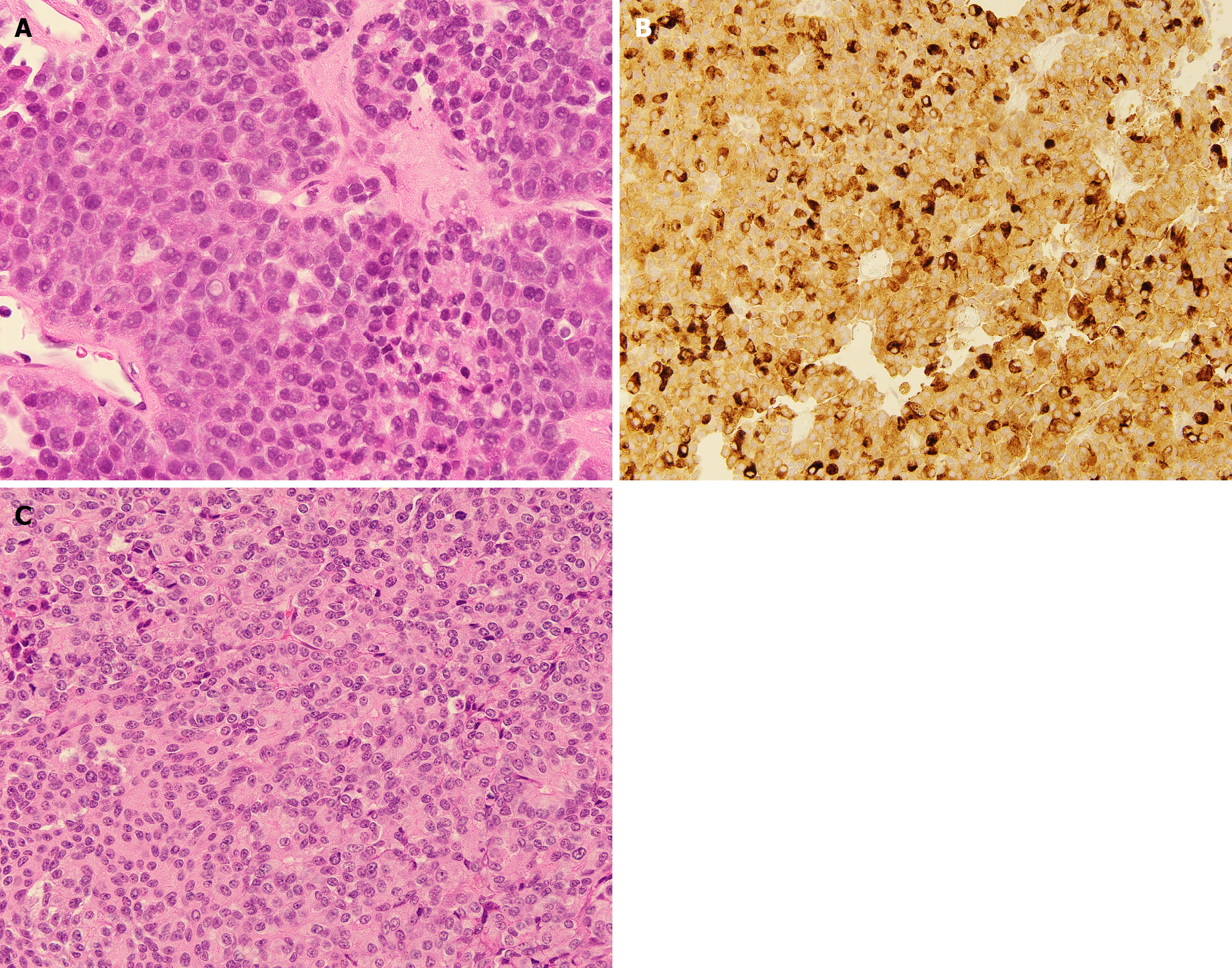 Figure 1 Representative histopathology and immunohistochemical staining of pancreatic acinar cell carcinoma and pancreatoblastoma.