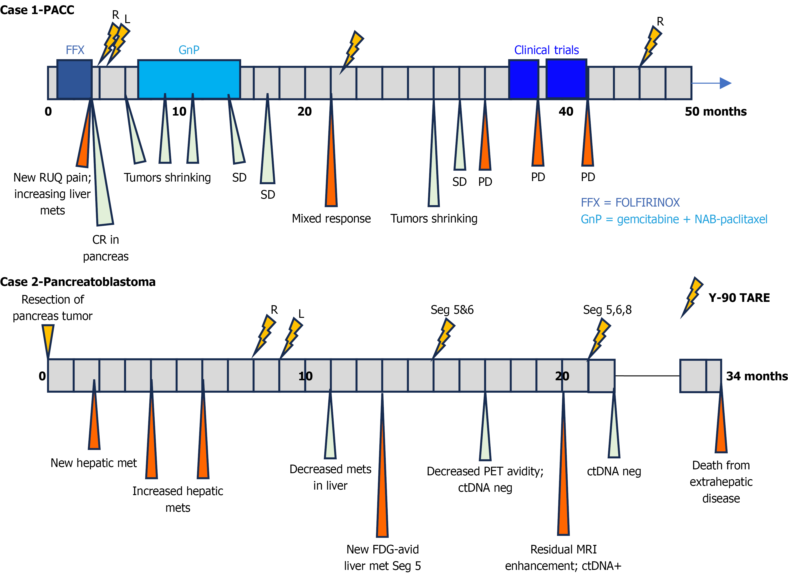 Local interventions such as yttrium-90 (Y-90) transarterial radioembolization are shown above the time bar. Liver area treated by Y-90 (if known) is indicated near each lightning bolt marking this intervention (R = right lobe, L = left lobe, Seg = segment). Both patients had no visible disease outside of liver when treated with Y-90 transarterial radioembolization. Results of clinical/ radiologic assessments are shown below the bar (green markers indicate favorable responses, while orange markers indicate unfavorable responses). Systemic therapies are marked by blue rectangles along the time bar that indicate duration of therapy. RUQ: Right upper quadrant; CR: Complete response; SD: Stable disease; PD: Progressing disease; met: Metastasis; FDG: Fluorodeoxyglucose; PET: Positron emission tomography; ctDNA: Circulating tumor DNA; Y-90: Yttrium-90; PACC: Pancreatic acinar cell carcinoma.