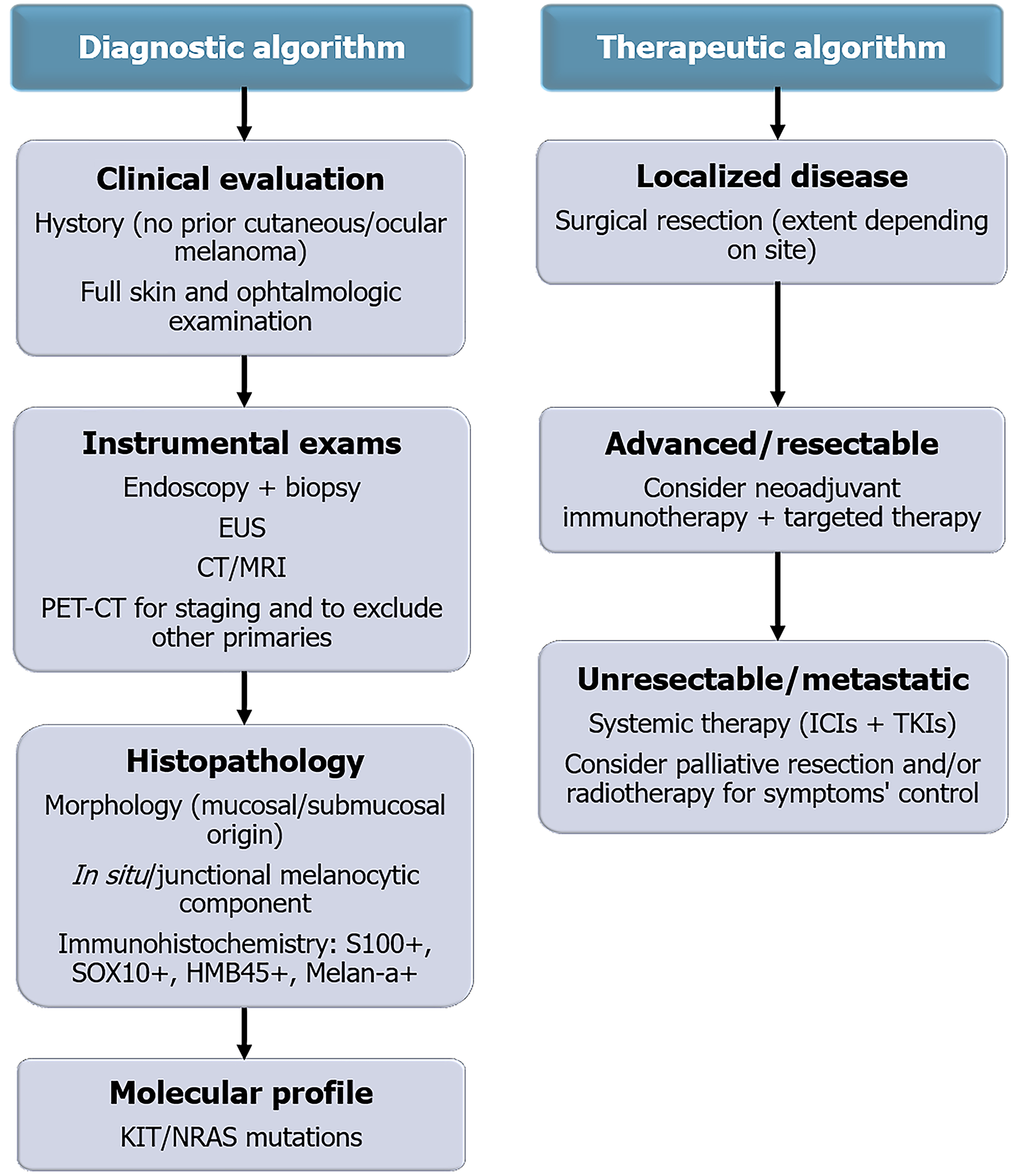 Figure 2 Diagnostic and therapeutic algorithm for mucosal gastrointestinal melanoma.
