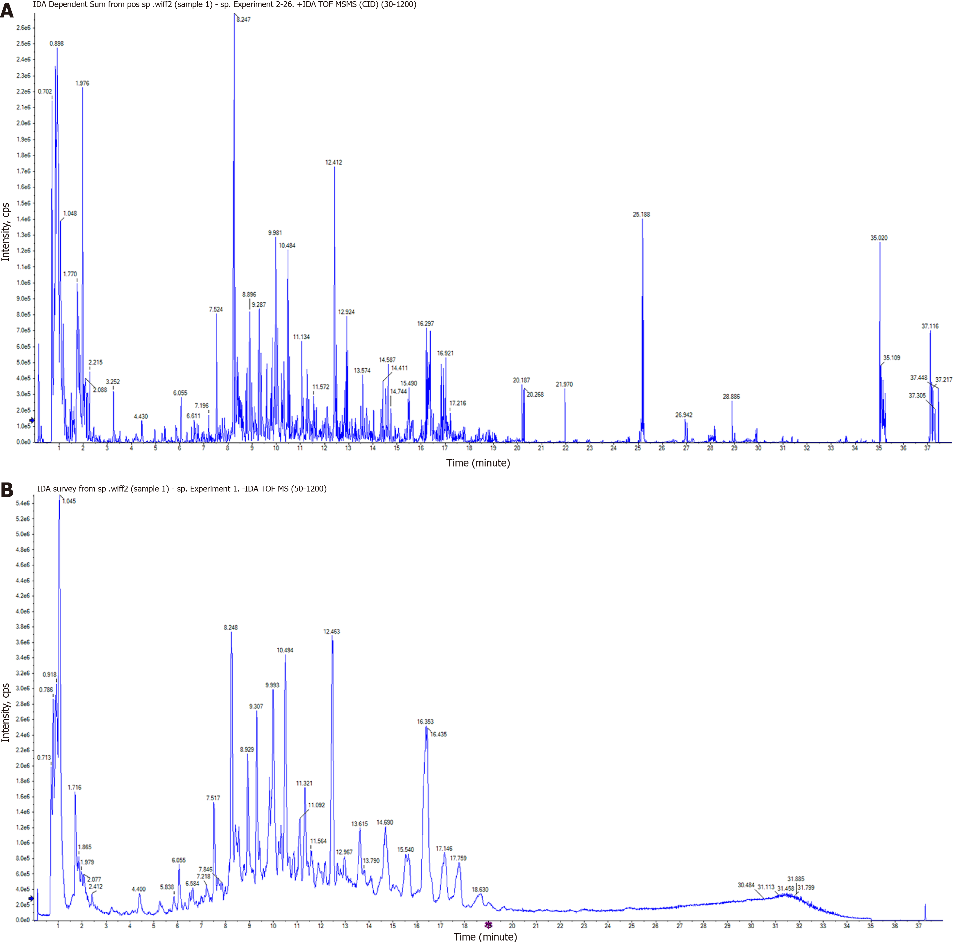 Xing-Pi-Qing-Gan decoction total ion current chromatogram obtained by ultra-high performance liquid chromatography quadrupole-time-of-flight mass spectrometry. A: Positive ion mode; B: Negative ion mode.