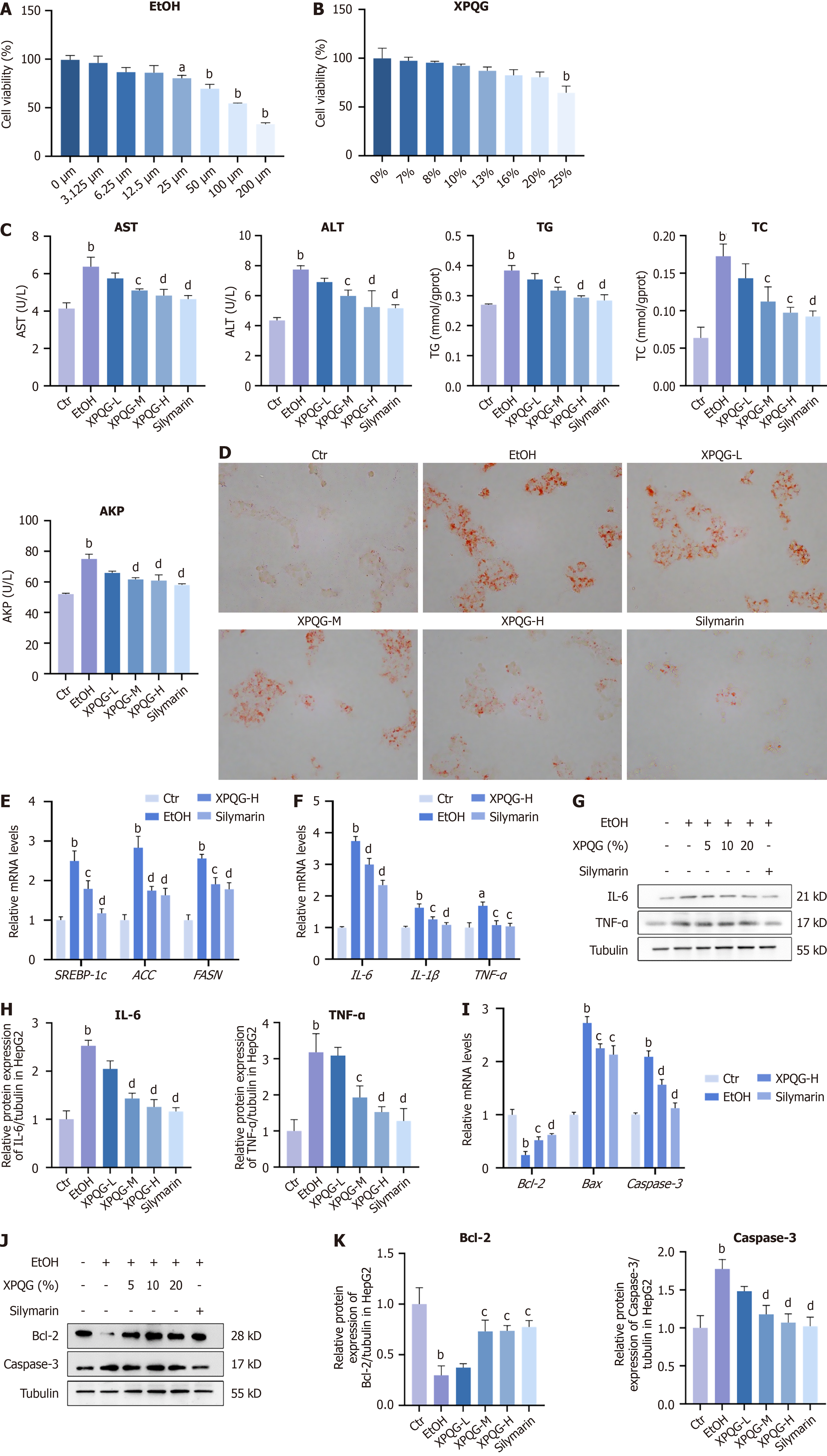A and B: Quantitation of cell viability of HepG2 cells treated with ethanol (A) and with Xing-Pi-Qing-Gan decoction (B) was determined by CCK-8 assay; C: HepG2 alanine aminotransferase, aspartate aminotransferase, triglyceride and alkaline phosphatase levels; D: Oil Red O staining, images were taken (40 ×); E: Relative mRNA levels of lipogenesis; F-H: Relative mRNA levels and relative protein expression of inflammation; I: Relative mRNA levels of Apoptosis; J and K: Relative protein expression of Bcl-2, Caspase-3 in HepG2 (n = 3-5). aP < 0.05 vs the control group; bP < 0.01 vs the control group; cP < 0.05 vs the ethanol-fed group; dP < 0.01 vs the ethanol-fed group. Ctr: Control; EtOH: Ethanol-fed; XPQG: Xing-Pi-Qing-Gan decoction; AST: Aspartate aminotransferase; ALT: Alanine aminotransferase; TG: Triglyceride; TC: Total cholesterol; AKP: Alkaline phosphatase; XPQG-L: Xing-Pi-Qing-Gan decoction-low; XPQG-M: Xing-Pi-Qing-Gan decoction-medium; XPQG-H: Xing-Pi-Qing-Gan decoction-high; IL-6: Interleukin-6; IL-1β: Interleukin-1β; TNF-α: Tumor necrosis factor-α.