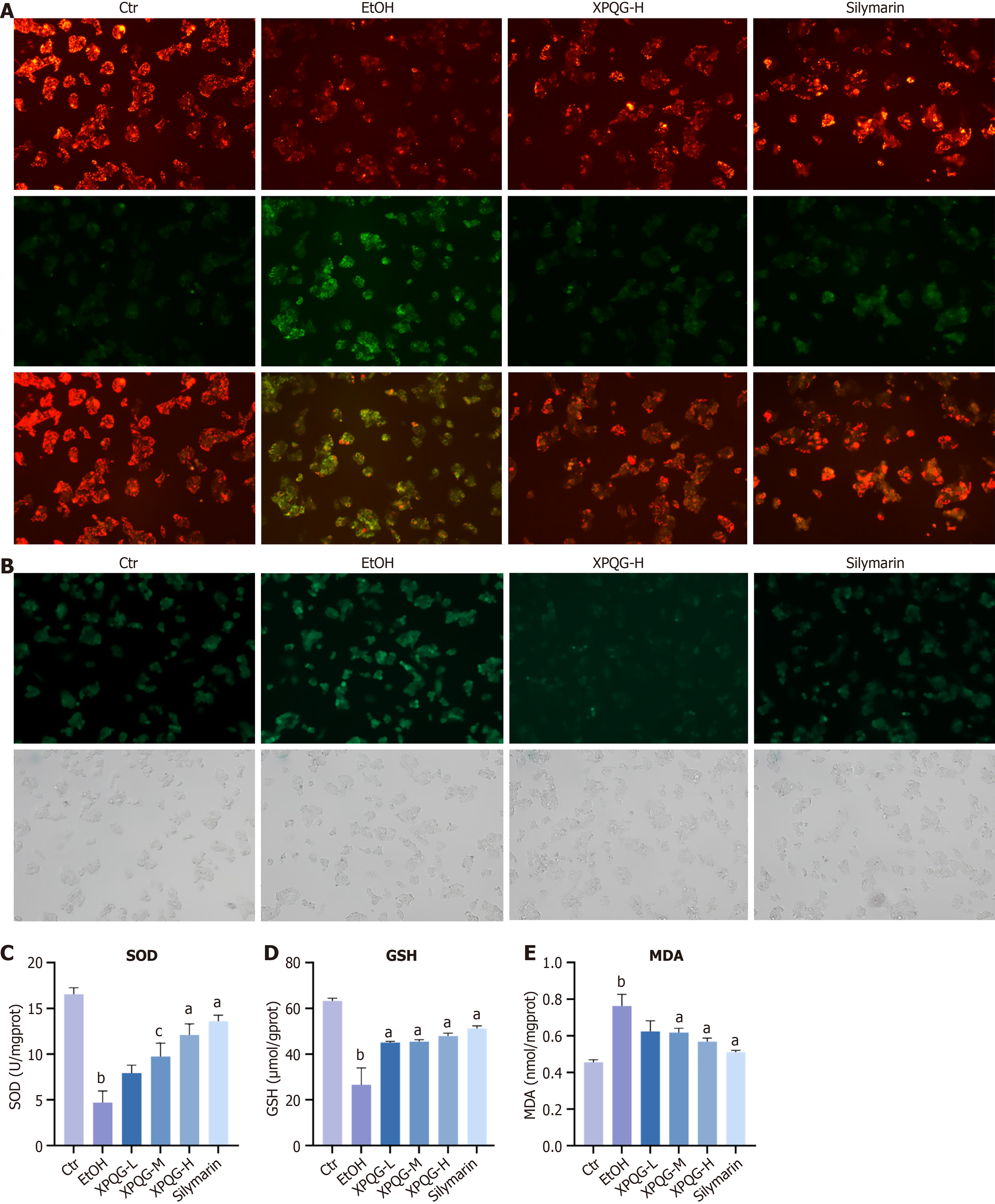 A: JC-1 of HepG2 (40 ×); B: Reactive oxygen species levels of HepG2 (40 ×); C-E: Superoxide dismutase, glutathione and malondialdehyde levels of HepG2 (n = 3-5). aP < 0.01 vs the ethanol-fed group; bP < 0.01 vs the control group; cP < 0.05 vs the ethanol-fed group. Ctr: Control; EtOH: Ethanol-fed; XPQG: Xing-Pi-Qing-Gan decoction; XPQG-L: Xing-Pi-Qing-Gan decoction-low; XPQG-M: Xing-Pi-Qing-Gan decoction-medium; XPQG-H: Xing-Pi-Qing-Gan decoction-high; SOD: Superoxide dismutase; GSH: Glutathione; MDA: Malondialdehyde.