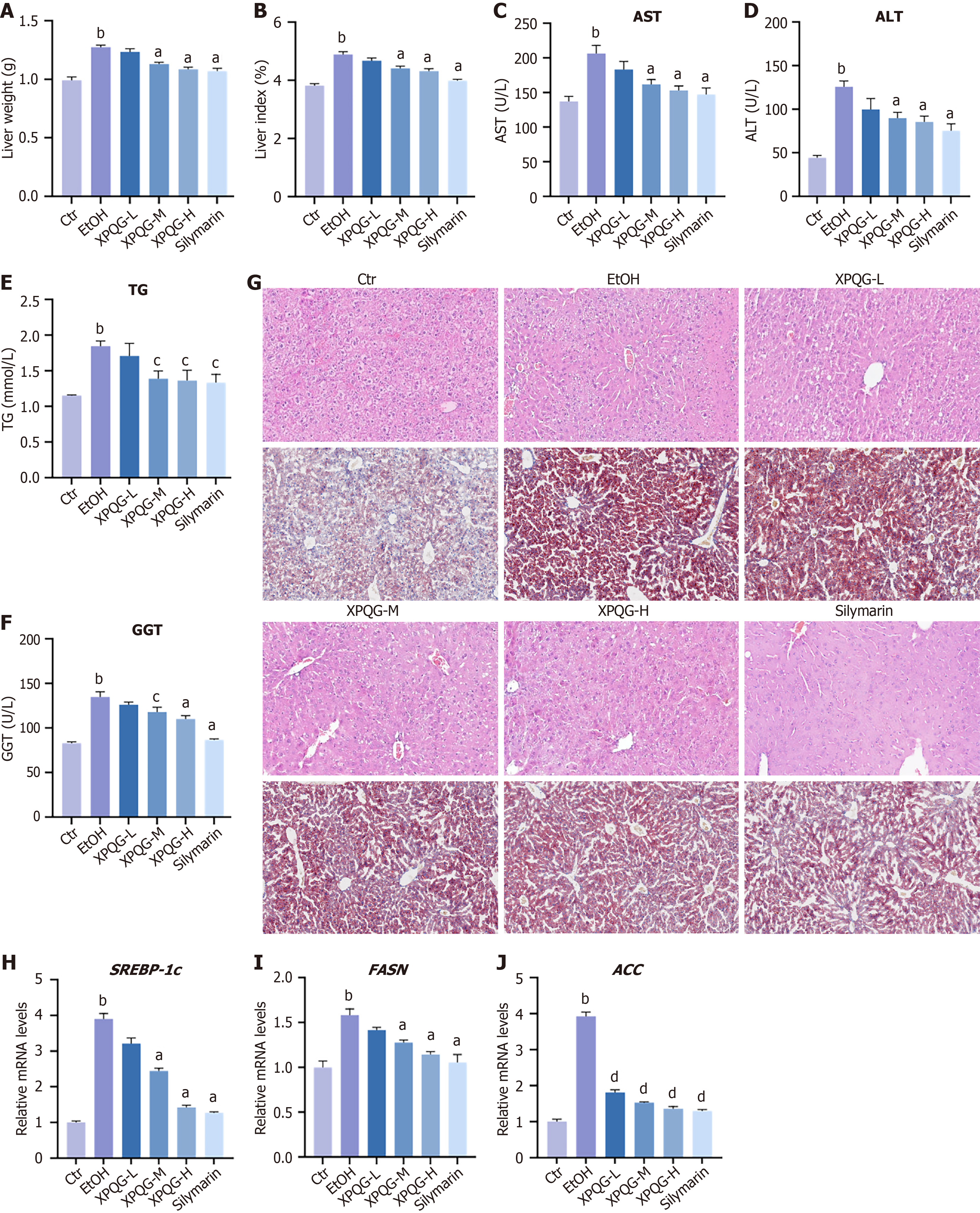 A and B: Effects of Xing-Pi-Qing-Gan decoction (XPQG) on body weight gain: Liver weight (A) and liver weight/body weight ratio values (B); C-F: Serum alanine aminotransferase, aspartate aminotransferase, triglyceride and the levels of γ-glutamyl transferase in liver; G: The images of representative hematoxylin and eosin or Oil Red O stained liver sections (40 ×); H-J: Effects of XPQG on the expression of relative mRNA expression in liver in lipid synthesis, including SREBP-1c, ACC, FASN (n = 6-8). aP < 0.01 vs the ethanol-fed group; bP < 0.01 vs the control group; cP < 0.05 vs the ethanol-fed group. Ctr: Control; EtOH: Ethanol-fed; AST: Aspartate aminotransferase; ALT: Alanine aminotransferase; TG: Triglyceride; GGT: γ-glutamyl transferase; XPQG-L: Xing-Pi-Qing-Gan decoction-low; XPQG-M: Xing-Pi-Qing-Gan decoction-medium; XPQG-H: Xing-Pi-Qing-Gan decoction-high.