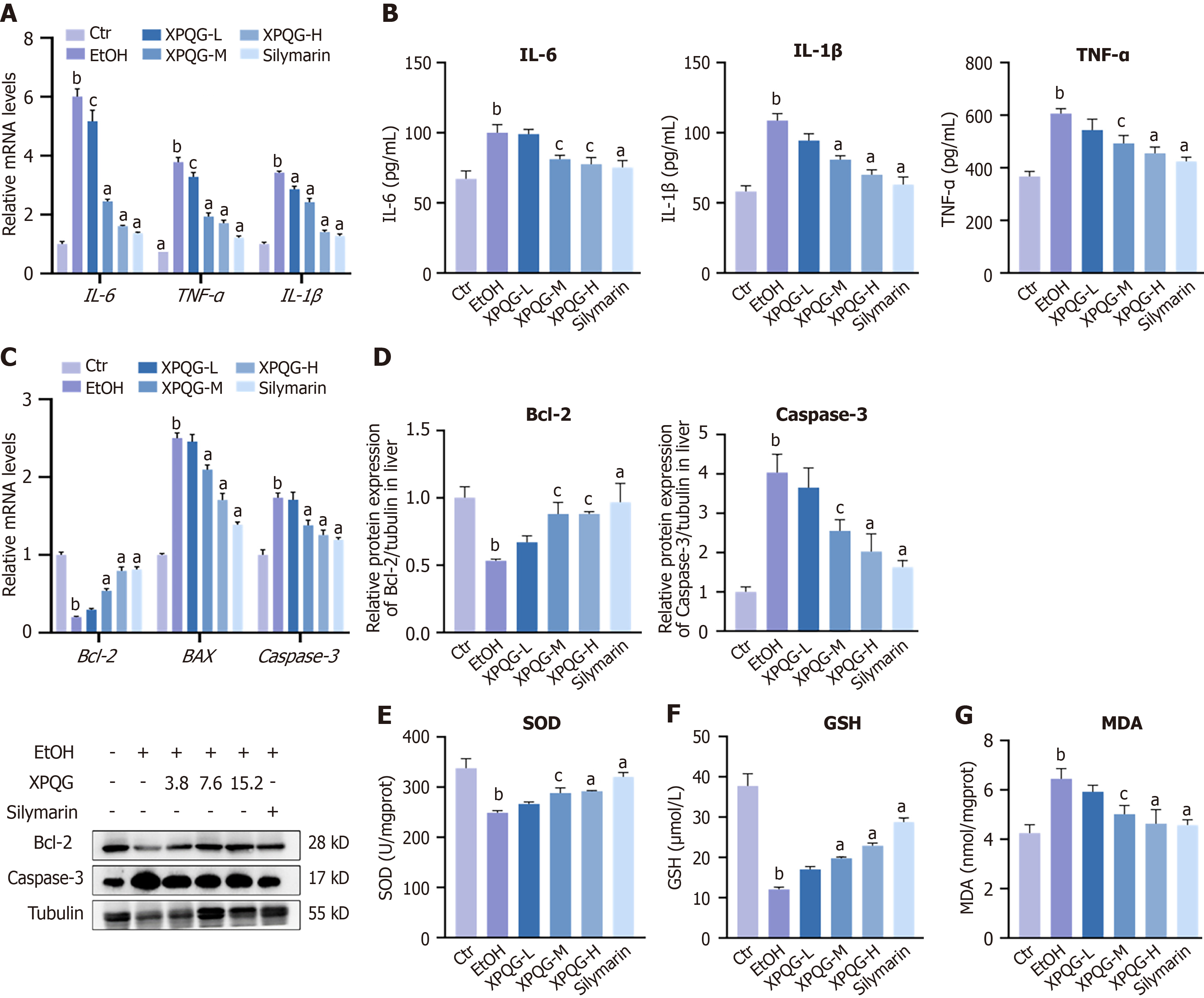 A: The relative mRNA expression of inflammation in mice; B: Serum inflammatory factor levels were determined, respectively, by enzyme-linked immunosorbent assay; C: Effects of Xing-Pi-Qing-Gan decoction on the expression of relative mRNA expression in apoptosis , including Bcl-2, BAX, and Caspase-3; D: Protein expression of Bcl-2 and Caspase-3; E-G: Superoxide dismutase, glutathione and malondialdehyde levels in livers (n = 6-8). aP < 0.01 vs the ethanol-fed group; bP < 0.01 vs the control group; cP < 0.05 vs the ethanol-fed group. IL-6: Interleukin-6; IL-1β: Interleukin-1β; TNF-α: Tumor necrosis factor-α; EtOH: Ethanol-fed; XPQG: Xing-Pi-Qing-Gan decoction; SOD: Superoxide dismutase; GSH: Glutathione; MDA: Malondialdehyde.