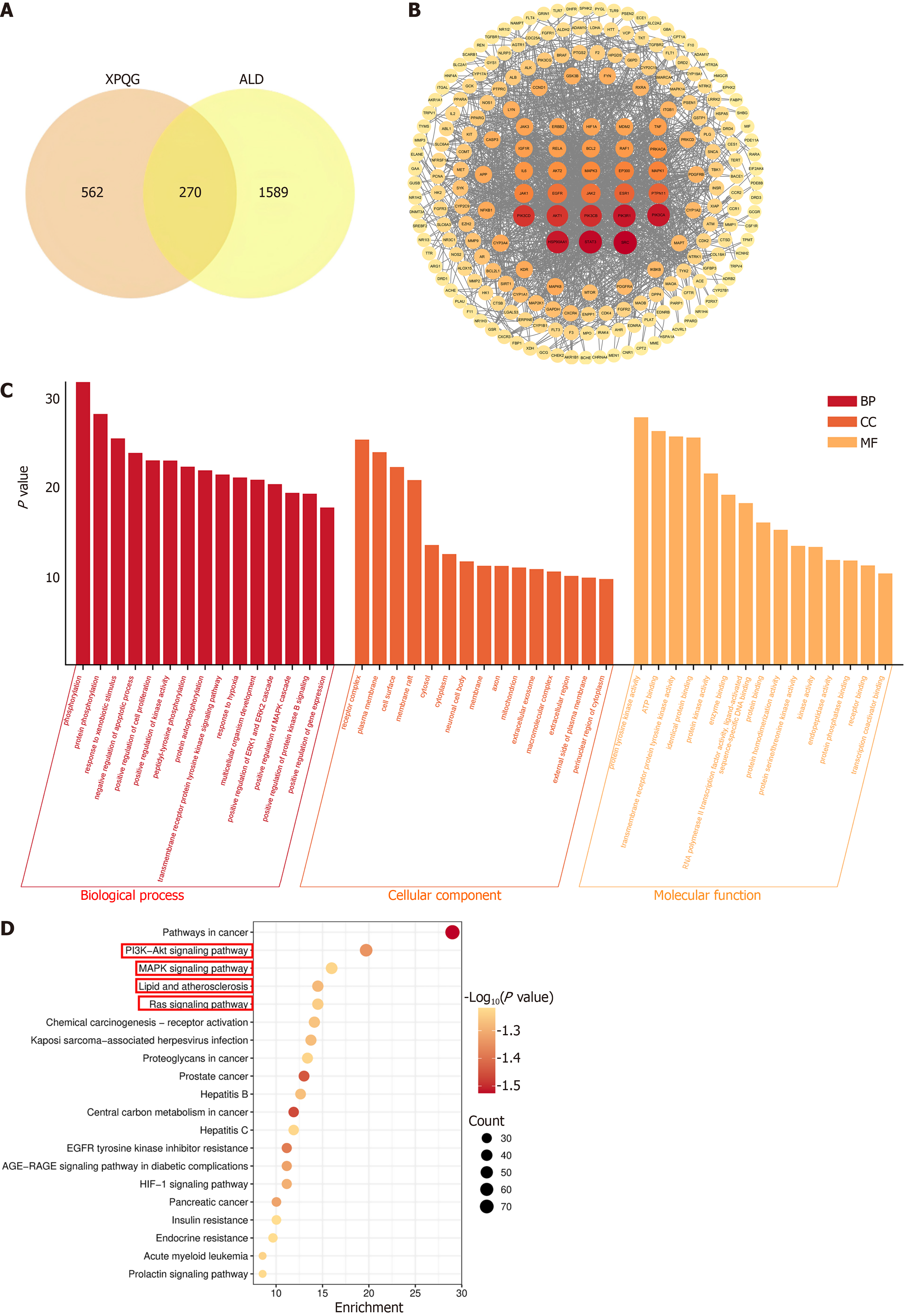 A: Intersection of “compound targets” and “disease targets”; B: Protein-Protein Interaction network; C: Gene Ontology enrichment analysis; D: Kyoto Encyclopedia of Genes and Genomes pathway analysis. XPQG: Xing-Pi-Qing-Gan decoction; ALD: Alcoholic liver disease; BP: Biological process; CC: Cellular component; MF: Molecular function.