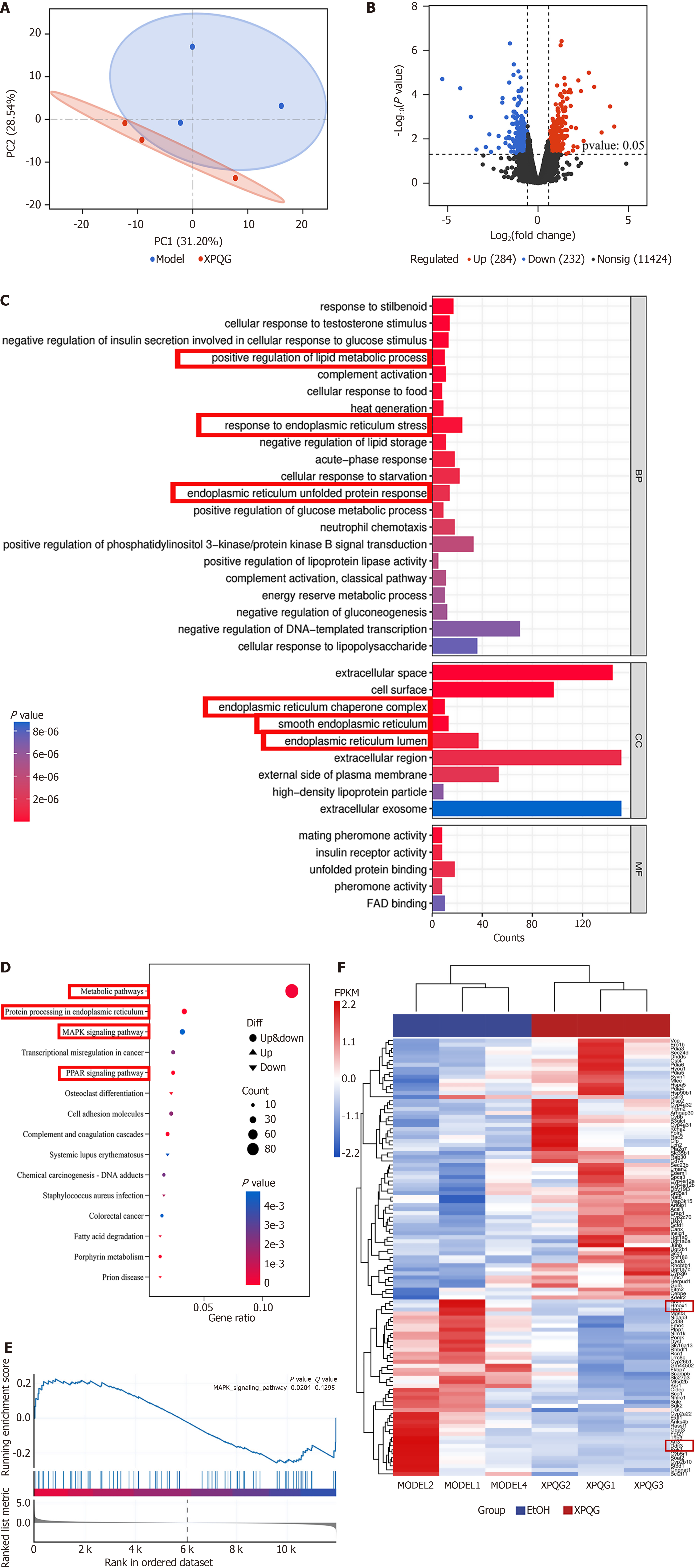 A: Principal component analysis; B: Volcano plot of differentially expressed mRNAs in alcoholic liver disease mice after Xing-Pi-Qing-Gan decoction intervention; C: Gene Ontology enrichment analysis of differentially expressed mRNAs; D: Kyoto Encyclopedia of Genes and Genomes pathway enrichment analysis of the differentially expressed genes from liver RNA-seq data. The top 15 significantly enriched pathways are shown; E: Gene Set Enrichment Analysis of differentially expressed mRNAs in MAPK significant pathways; F: Heatmap shows endoplasmic reticulum-related differentially expressed genes. XPQG: Xing-Pi-Qing-Gan decoction.