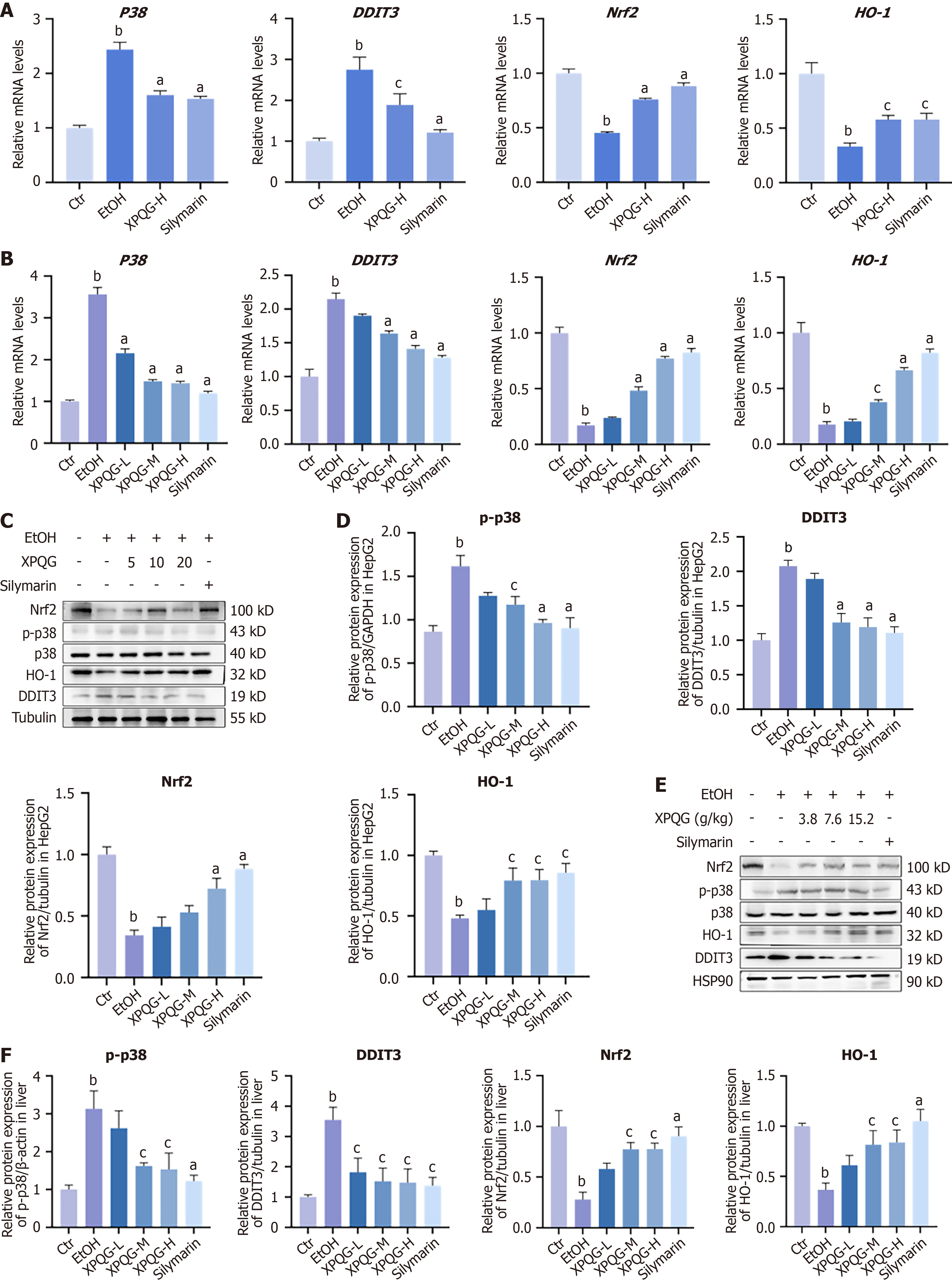 A: The relative mRNA expression of p38, DDIT3, Nrf2, HO-1 in HepG2; B: The relative mRNA expression of p38, DDIT3, Nrf2, HO-1 in mice; C and D: Representative protein expression of Nrf2, p-p38, p38, HO-1 and DDIT3 in HepG2; E and F: Representative protein expression of Nrf2, p-p38, p38, HO-1 and DDIT3 in mice (n = 3-5). aP < 0.01 vs the ethanol-fed group; bP < 0.01 vs the control group; cP < 0.05 vs the ethanol-fed group. Ctr: Control; EtOH: Ethanol-fed; XPQG: Xing-Pi-Qing-Gan decoction; XPQG-L: Xing-Pi-Qing-Gan decoction-low; XPQG-M: Xing-Pi-Qing-Gan decoction-medium; XPQG-H: Xing-Pi-Qing-Gan decoction-high.
