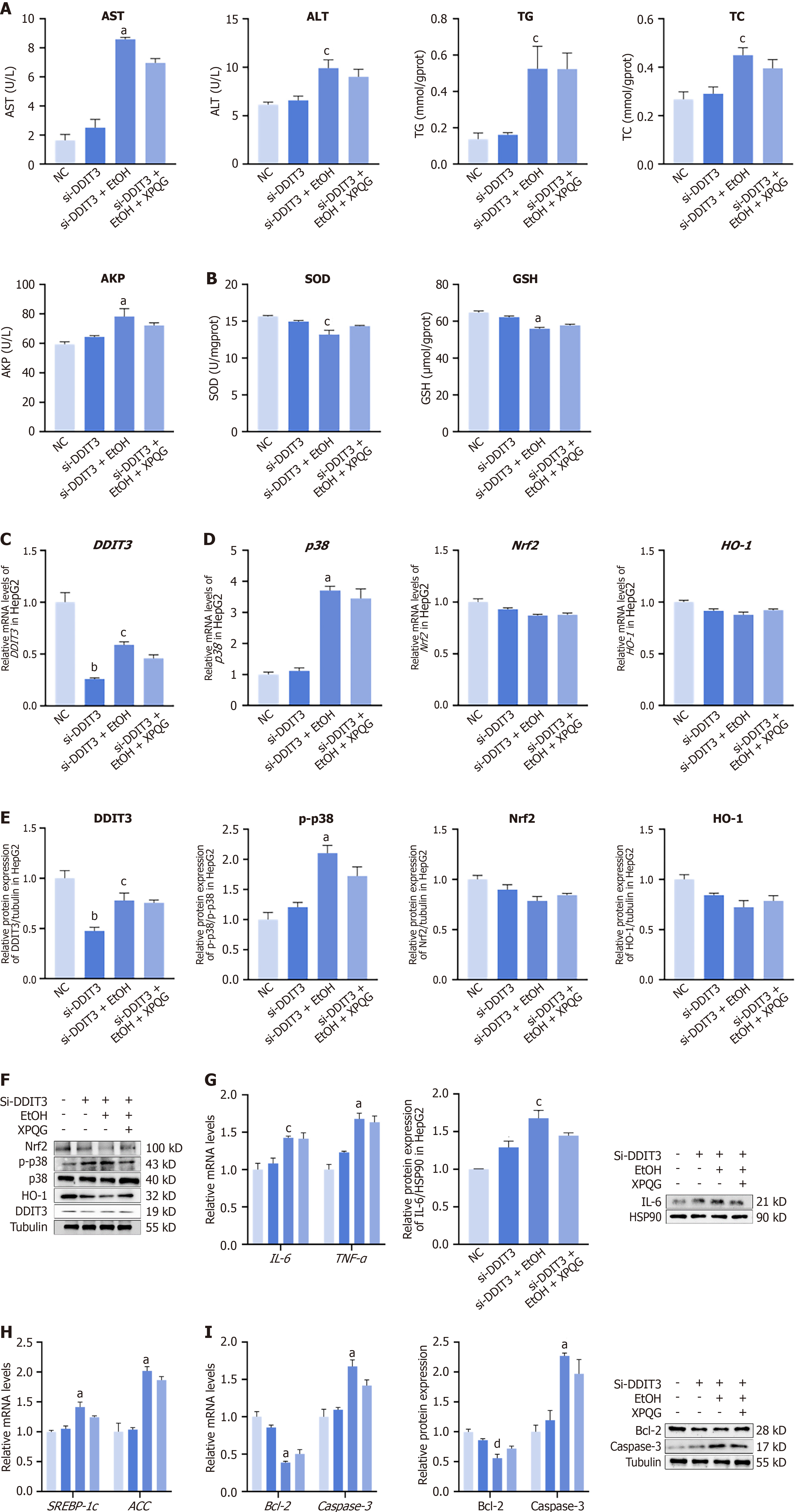 A: The effects of Xing-Pi-Qing-Gan decoction (XPQG) on alanine aminotransferase, aspartate aminotransferase, triglyceride, total cholesterol, and alkaline phosphatase expression in HepG2 cells as transfected with DDIT3 siRNA; B: After transfected with DDIT3 siRNA, XPQG had no obvious effect on the expression of superoxide dismutase and glutathione; C: Transcript levels of DDIT3 were measured by quantitative RT-PCR in HepG2 cells as transfected with DDIT3 siRNA; D: Relative mRNA levels of p38, Nrf2 and HO-1 in HepG2 cells as transfected with DDIT3 siRNA; E and F: Relative protein expression of DDIT3, p38, Nrf2 and HO-1 in HepG2 cells as transfected with DDIT3 siRNA; G: Effects of XPQG on the expression of inflammatory factors in HepG2 in HepG2 cells as transfected with DDIT3 siRNA; H: Relative mRNA levels of SREBP1-c and ACC in HepG2 cells as transfected with DDIT3 siRNA; I: Effects of XPQG on the expression of Apoptosis in HepG2 cells as transfected with DDIT3 siRNA (n = 3-5). aP < 0.01 vs si-DDIT3 group; bP < 0.01 vs negative control group; cP < 0.05 vs the si-DDIT3 group. ALT: Alanine aminotransferase; TG: Triglyceride; TC: Total cholesterol; AKP: Alkaline phosphatase; SOD: Superoxide dismutase; GSH: Glutathione; NC: Negative control; IL-6: Interleukin-6; EtOH: Ethanol-fed; XPQG: Xing-Pi-Qing-Gan decoction.
