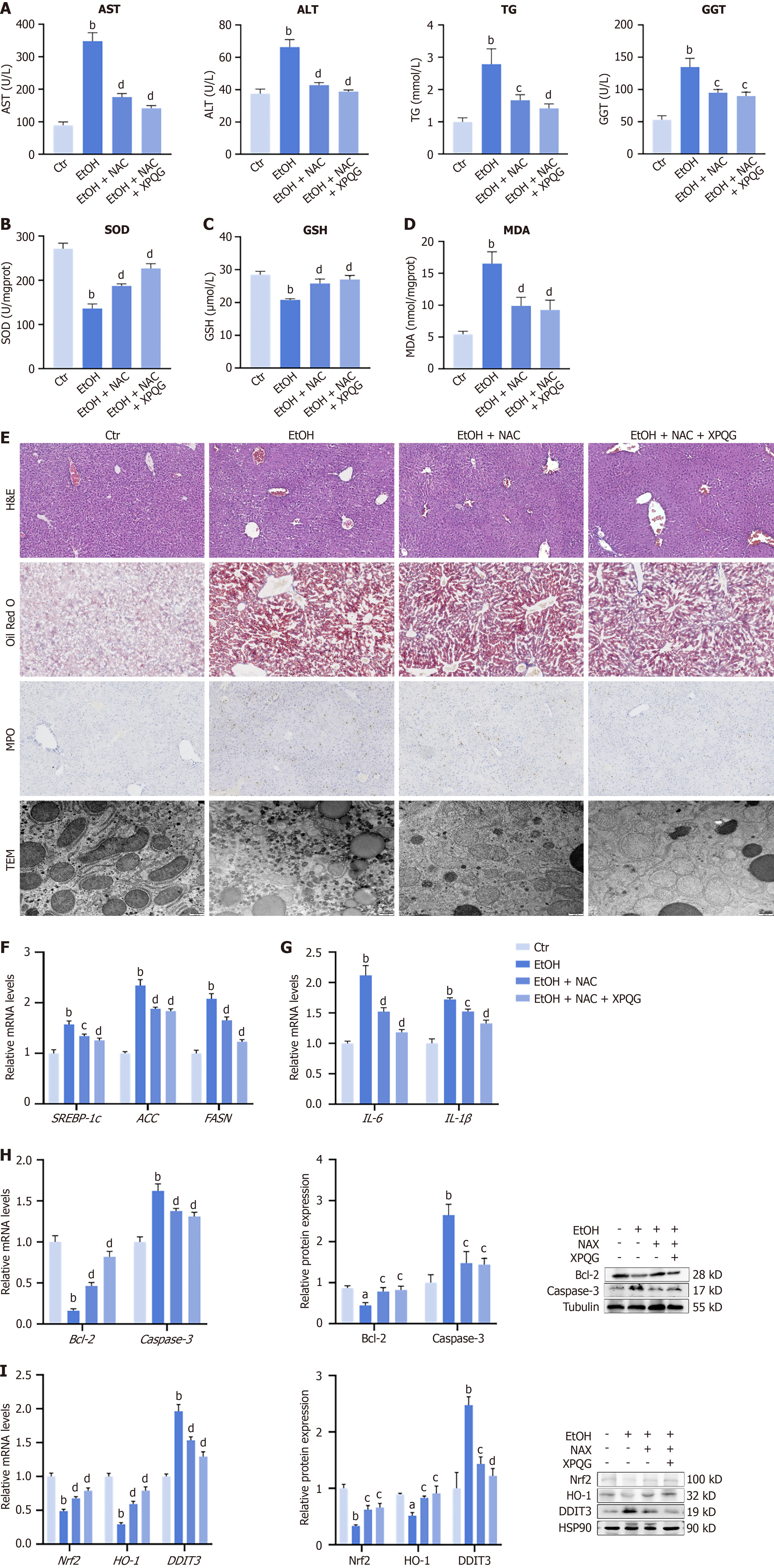 A: Hepatic parameters including alanine aminotransferase, aspartate aminotransferase, triglyceride and alkaline phosphatase (n = 6-8); B-D: Oxidative stress levels include liver glutathione, malondialdehyde, and superoxide dismutase in each group (n = 6-8); E: Pathomorphological changes in liver evaluated by hematoxylin and eosin (40 ×), Oil Red O staining (40 ×), immunohistochemistry staining of MPO (40 ×) and transmission electron microscopy analysis (25000 ×) in liver tissues of mice (n = 3); F: Relative mRNA levels of lipid metabolism, including SREBP1-c, ACC, FASN (n = 6-8); G: Relative mRNA levels of inflammation (n = 6-8); H: Effects of N-acetylcysteine and Xing-Pi-Qing-Gan decoction on the expression of Bcl-2 and Caspase-3 (n = 3-5); I: Relative mRNA levels and protein expression levels of Nrf2, HO-1, DDIT3 (n = 3-5). aP < 0.05 vs the control group; bP < 0.01 vs the control group; cP < 0.05 vs the ethanol-fed group; dP < 0.01 vs the ethanol-fed group. AST: Aspartate aminotransferase; ALT: Alanine aminotransferase; TG: Triglyceride; GGT: γ-glutamyl transferase; SOD: Superoxide dismutase; GSH: Glutathione; MDA: Malondialdehyde; Ctr: Control; EtOH: Ethanol-fed; NAC: N-acetylcysteine; XPQG: Xing-Pi-Qing-Gan decoction.