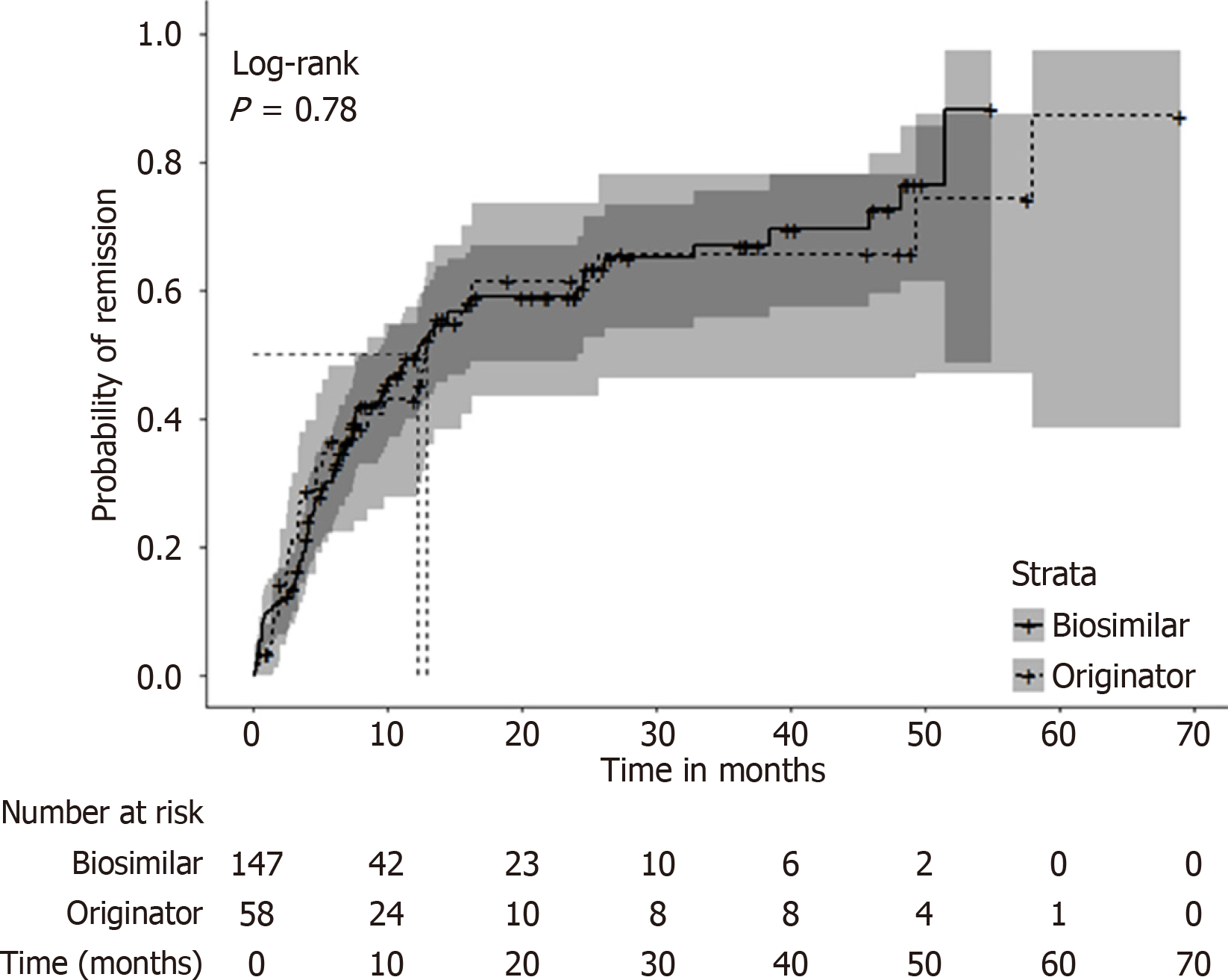 The median time to clinical remission was 12.8 months [95% con fidence interval (95%CI): 7.5-23.8 months] for originator users and 12.2 months (95%CI: 9.3-24.1 months) for biosimilar users. No significant difference in the time to achieve remission between biosimilar and originator users was detected.