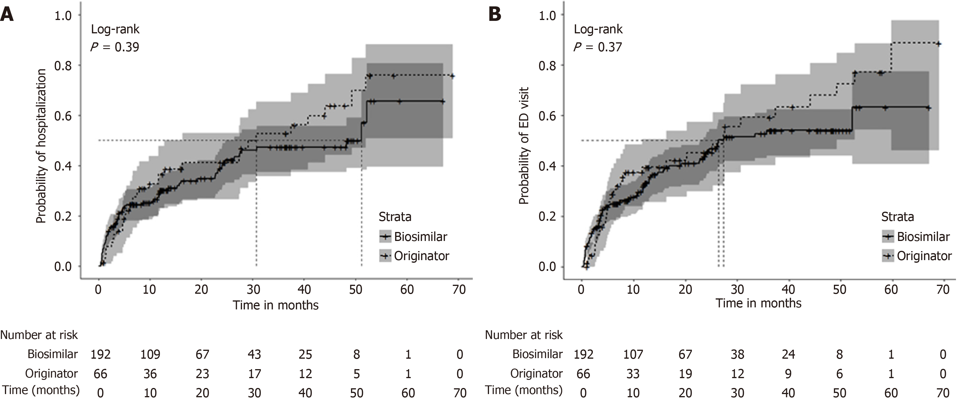 A: First hospitalization; B: First emergency department (ED) visit. The median time to first hospitalization estimated by Kaplan-Meier analysis was 30.7 months [95% confidence interval (95%CI): 12.8-52.1 months] for originator users and 51.2 months (95%CI: 24.6-72.3 months) for biosimilar users with no statistically significant difference between groups (A). The median time to first ED visit was 27.4 months (95%CI: 11.6-49.3 months) for originator users and 26.4 months (95%CI: 22.6-53.4 months) for biosimilar users (B). ED: Emergency department.
