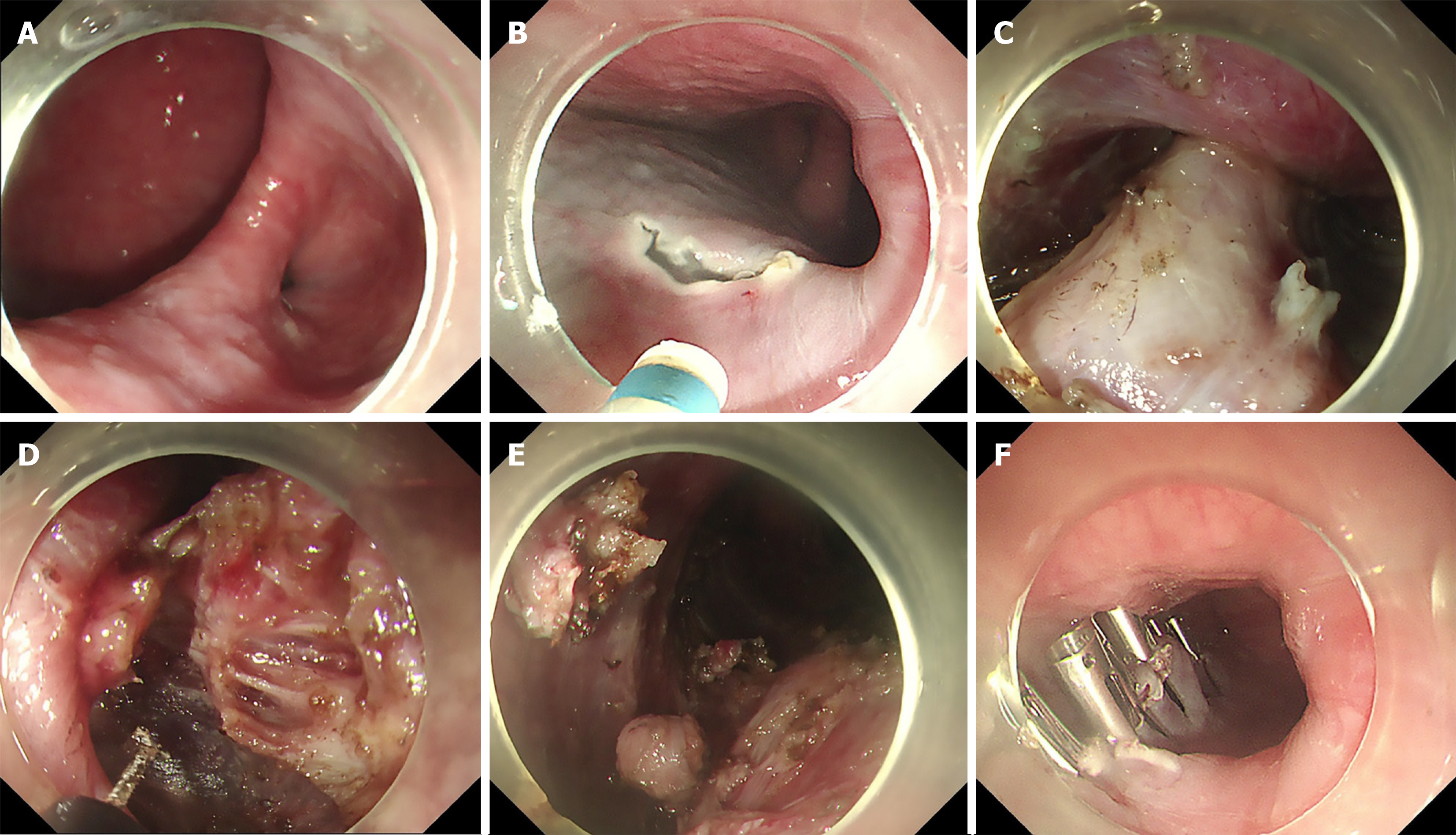 A: Large epiphrenic diverticulum; B: Submucosal injection of methylene blue saline solution; C: Exposure of septum; D: Removal of the diverticulum septum; E: Completion of septum division and myotomy; F: Mucosal incision closed with clips.
