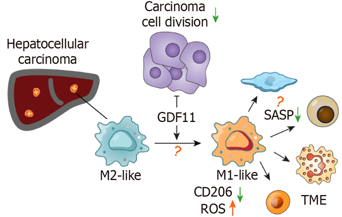 In the immunosuppressive tumor microenvironment, pro-tumoral M2-like macrophages promote cancer cell proliferation. growth differentiation factor 11 counteracts this by directly suppressing tumor growth and simultaneously reprogramming M2-like macrophages toward an anti-tumoral M1-like state. This reprogramming is characterized by the downregulation of the M2 marker CD206 and an increase in reactive oxygen species. Future investigations will determine the roles of underlying metabolic rewiring, epigenetic reprogramming, and the potential for growth differentiation factor 11 to suppress a pro-tumoral senescence-associated secretory phenotype. GDF11: Growth differentiation factor 11; ROS: Reactive oxygen species; SASP: Senescence-associated secretory phenotype; TME: Tumor mic roenvironment.