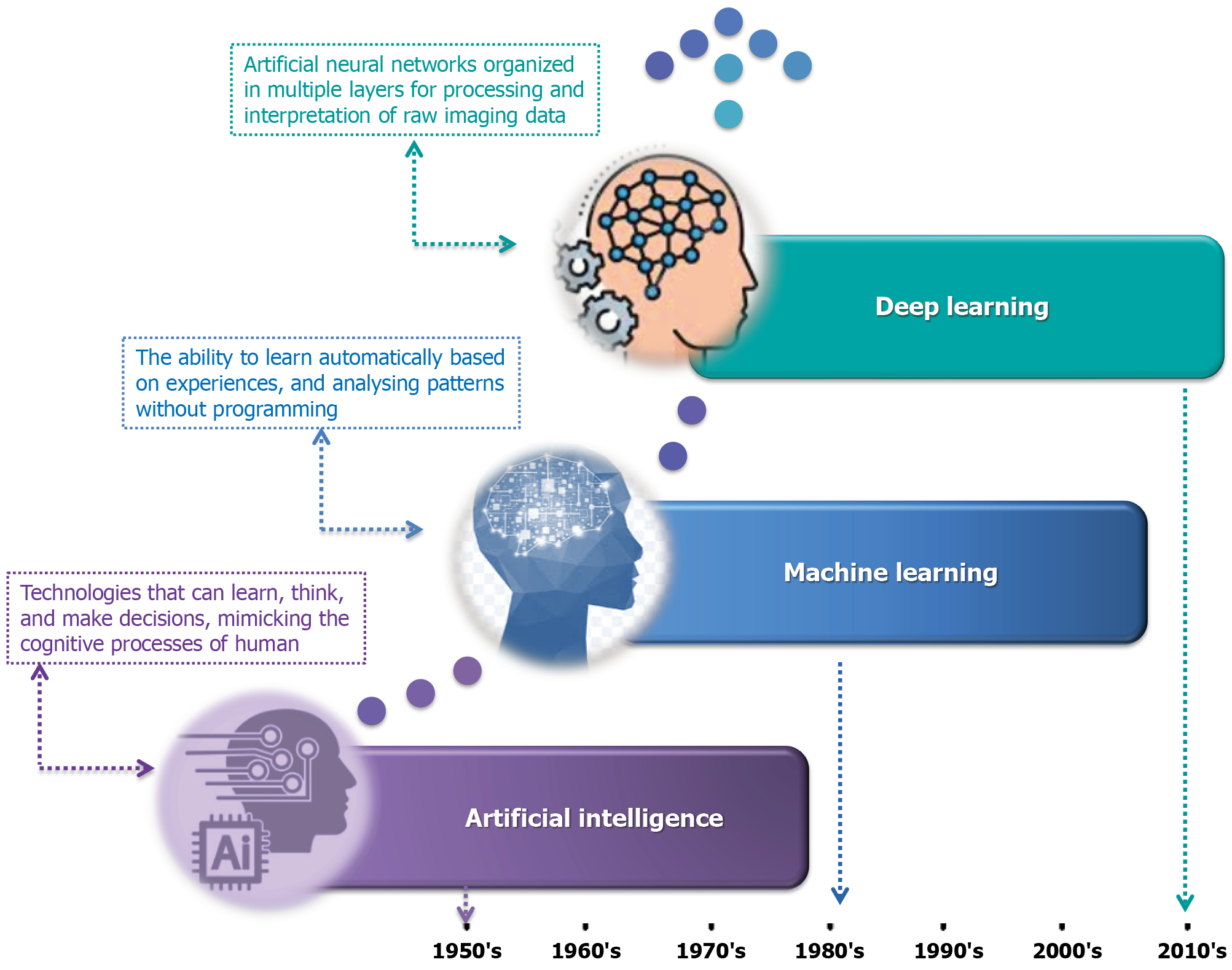 Artificial intelligence (AI) was first described in the 1950s with limited early technological models, which prevented their widespread adoption in medicine. With the development of deep learning (DL) techniques in the early 2000s, there have been substantial improvements[5]. Figure 1 provides an overview of the evolution of AI technologies.