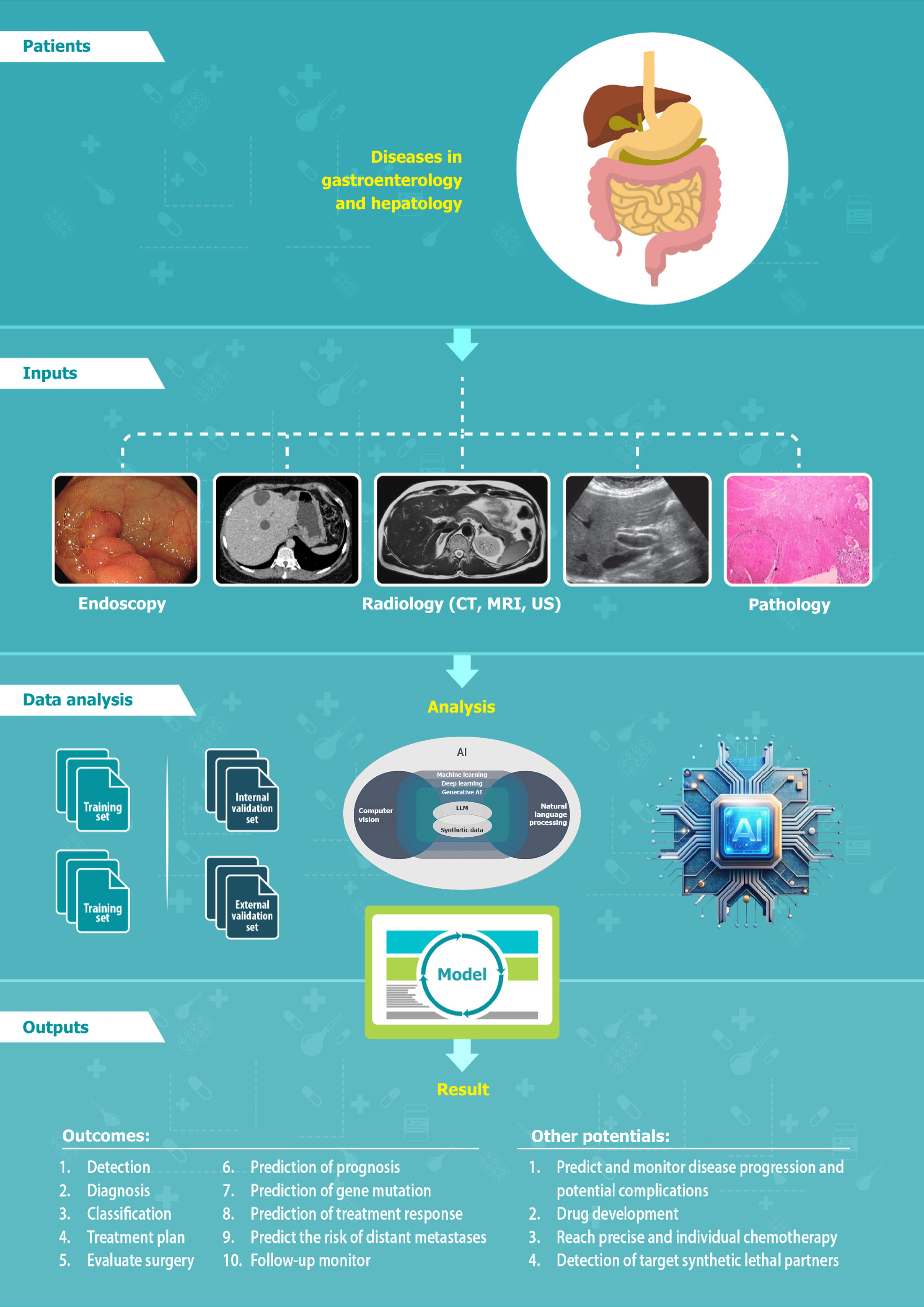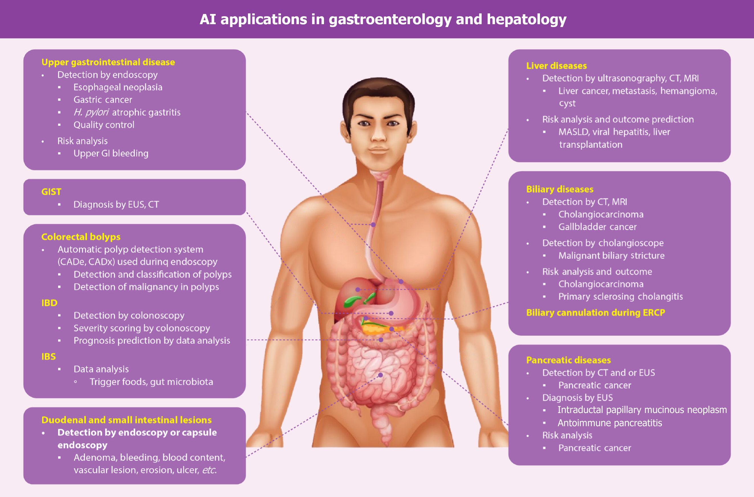 Artificial intelligence (AI) has drastically revolutionized the healthcare system, including the clinical diagnosis and treatment, resulting in the subsequent increase in the quality of life[1]. This has emerged as a transformative tool in the diagnosis and management of gastrointestinal (GI) and liver diseases. In one systematic review it was shown that among several published randomized controlled trials of AI-assisted tools in clinical practice, more studies were done in the field of gastroenterology (30 out of 39), and it was demonstrated that the performance of AI-assisted tools surpassed that of usual clinical care[2]. AI has been used in several GI diseases such as esophageal neoplasia, gastric cancer, Helicobacter pylori (H. pylori) infection, gastritis, GI stromal tumors (GISTs), colorectal polyps, inflammatory bowel disease (IBD), irritable bowel syndrome (IBS), GI bleeding, and pancreatobiliary diseases. The potential applications of AI in liver diseases encompass a variety of conditions such as liver masses, metabolic dysfunction-associated steatotic liver disease (MASLD), viral hepatitis, cirrhosis, and liver transplantation (LT). The applications of AI in gastroenterology and hepatology are shown in the Figure 1. This review discussed the common terminologies and the current status of AI in gastroenterology and hepatology, exploring its applications and ethical issues.
