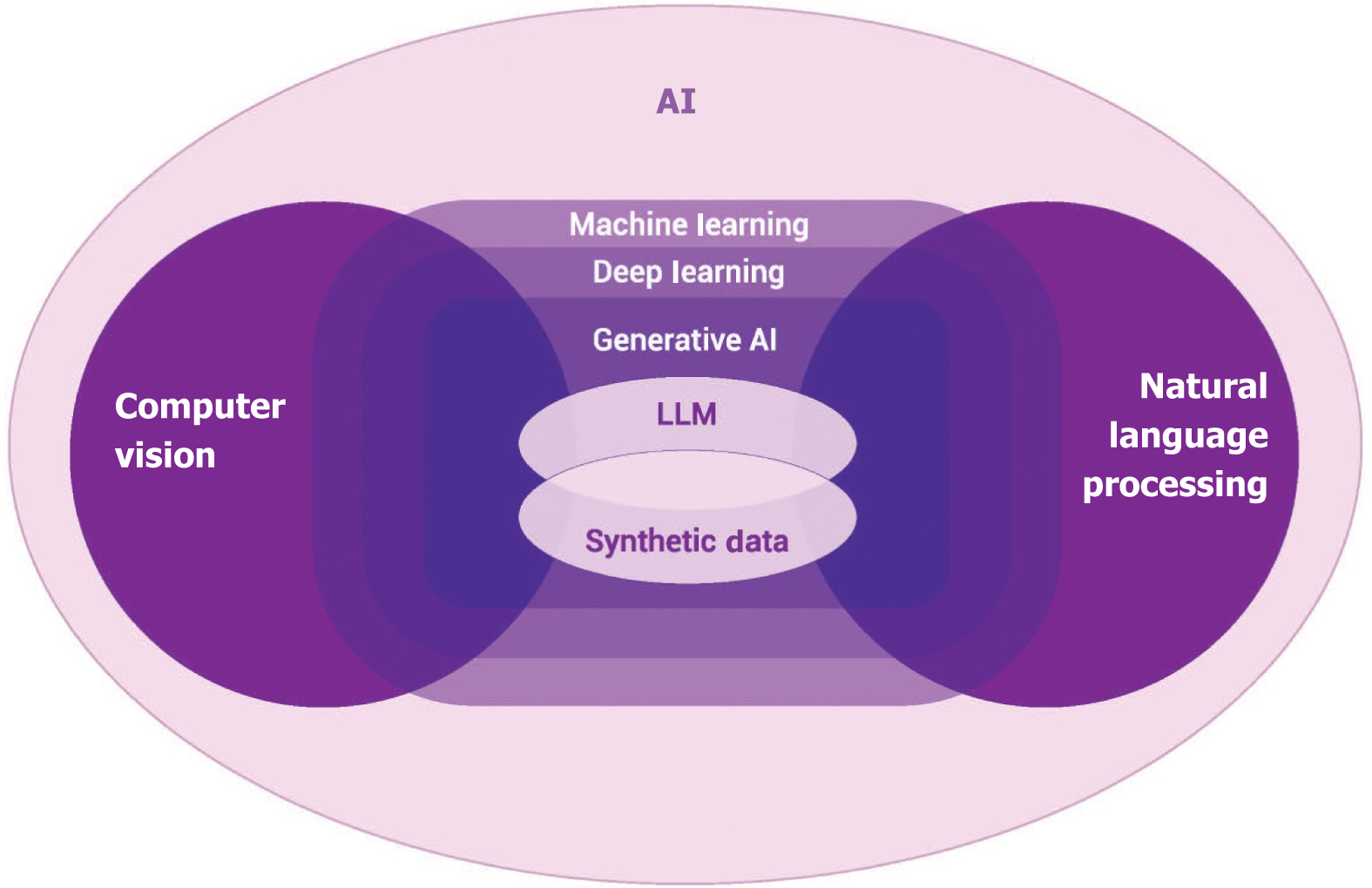 AI involves a computer program that uses a multitude of techniques to resolve different problems and mimics human intelligence[3]. In clinical practice several overlapping tools of AI are used, such as machine learning (ML), deep learning (DL), natural language processing (NLP), computer vision, and generative AI. The landscape of AI is depicted in Figure 2.