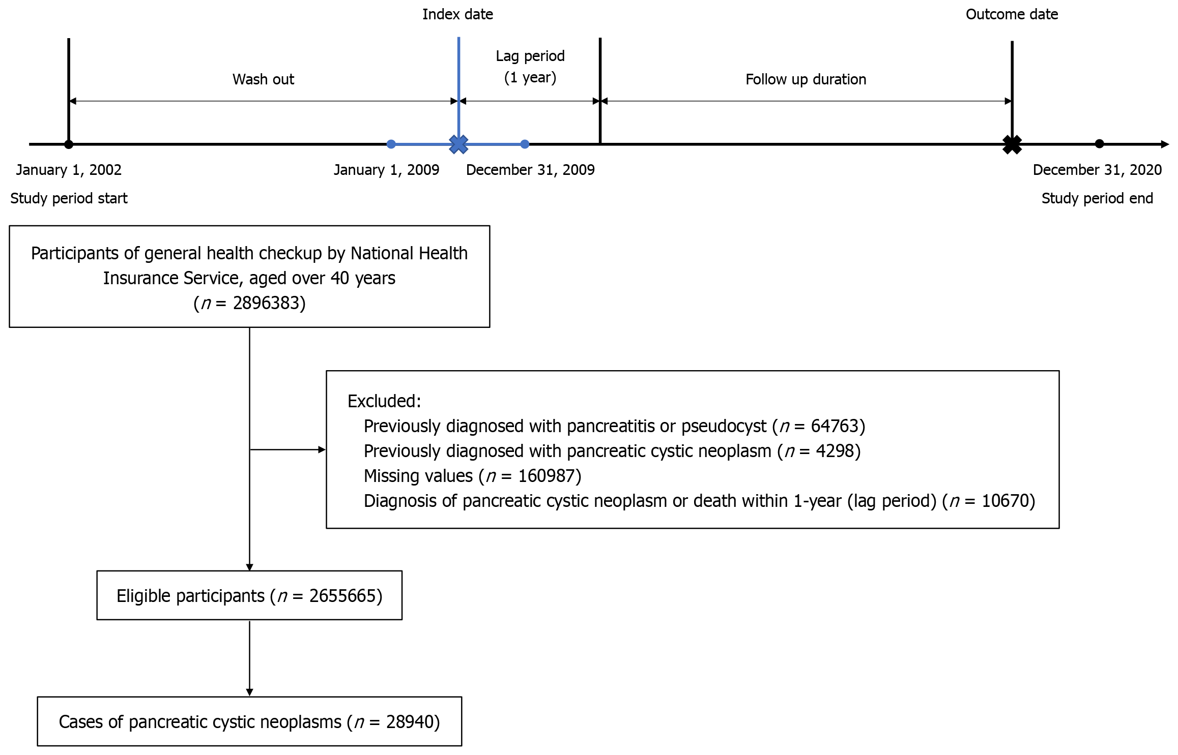Participants underwent general health checkups in 2009 (index period), and a one-year lag period was applied. The follow-up period was until December 31, 2020. Among the 2896383 participants aged 40 years or older, those with a history of pancreatitis or pseudocyst (n = 64763), or a previous diagnosis of pancreatic cystic neoplasm (n = 4298), those with missing data (n = 160987), or those who were diagnosed with pancreatic cystic neoplasm or died within the one-year lag period (n = 10670) were excluded. The final study population consisted of 2655665 individuals, of whom 28940 developed pancreatic cystic neoplasm during the follow-up period.