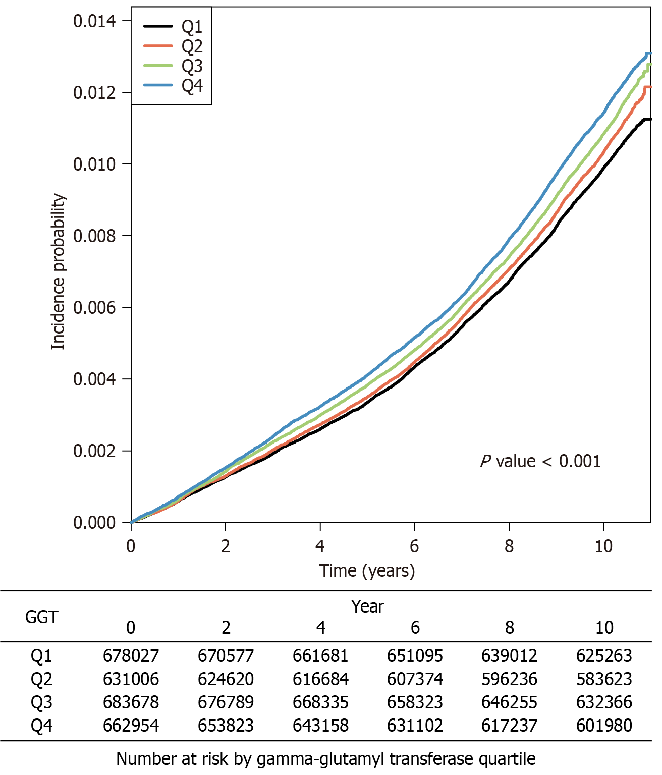 Figure 2 Incidence probability of pancreatic cystic neoplasm stratified by gamma-glutamyl transferase level.