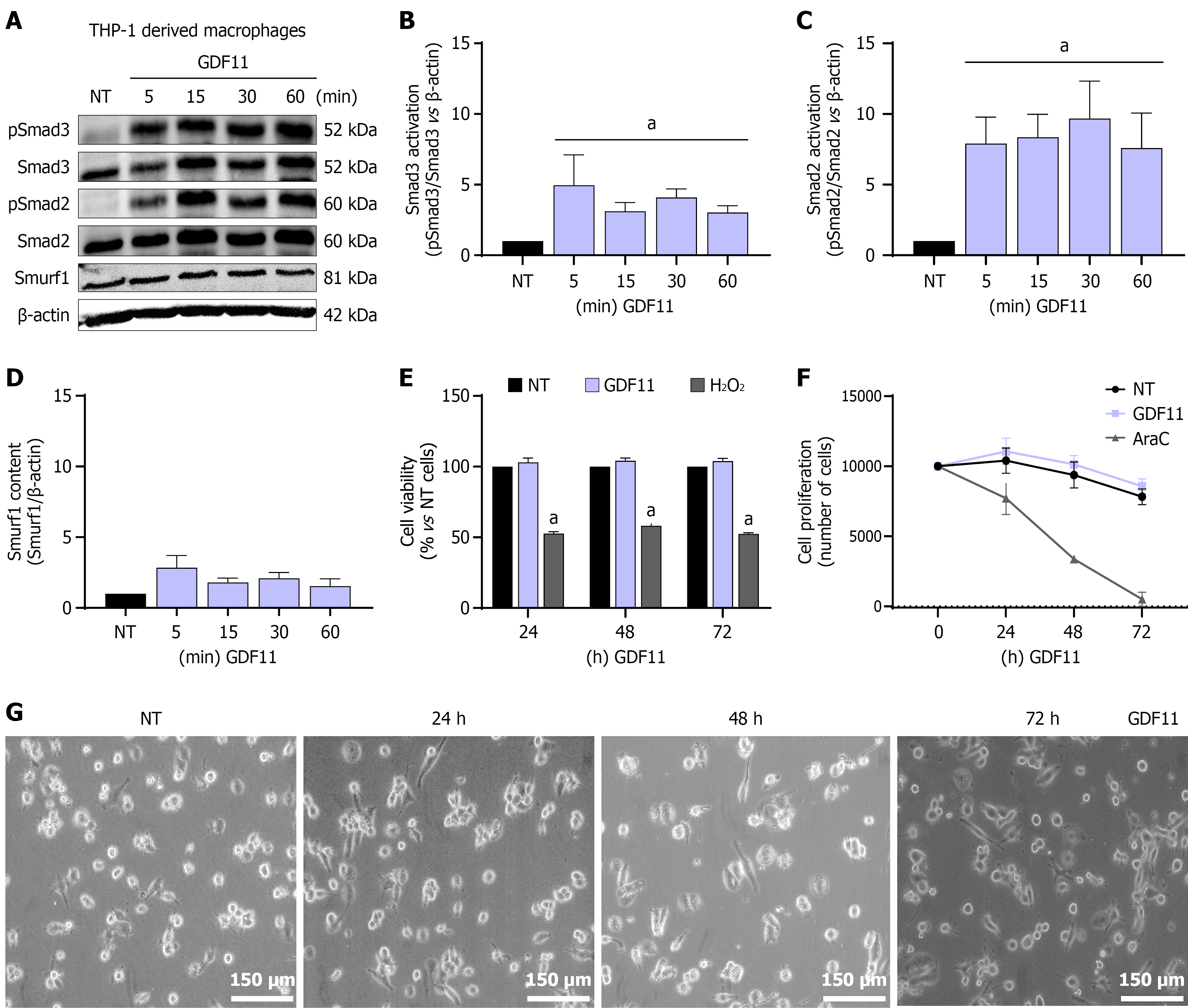 A: Representative images of western blots; B-D: Densitometry analysis (β-actin was used as a loading control); E: Cell viability (H2O2 was used as a negative control); F: Cell proliferation (cytarabine was used as a negative control); G: Cellular morphology, each image is representative of at least three independent experiments. Scale bars: 150 μm (200 ×, original magnification). Each column or point represents the mean ± SEM of at least three independent experiments carried out in triplicate. aP ≤ 0.05 vs not treated cells. GDF11: Growth differentiation factor 11; NT: Not treated cells; AraC: Cytarabine.