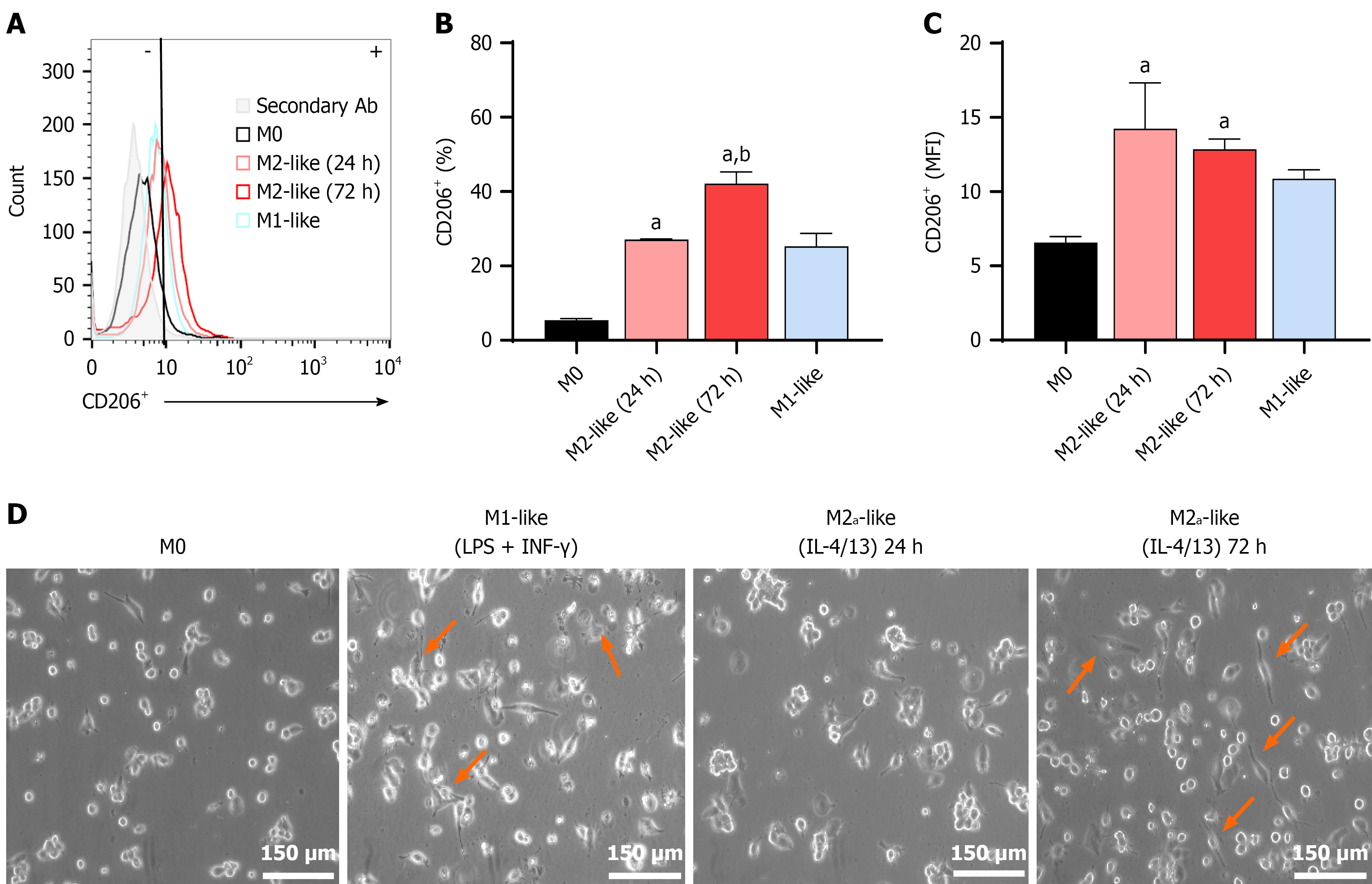 A: Fluorescence histogram of the expression of the cluster of differentiation 206 (CD206) marker obtained by flow cytometry; B: Percentage of CD206+ cells in IL-4/IL-13-treated macrophages (M2-like); C: Represents the mean fluorescent intensity of the CD206+ subset; D: Macrophage morphology under the different treatments, orange arrows show specific morphology. Images are representative of at least three independent experiments. Scale bars: 150 μm (200 ×, original magnification). Each column represents the mean ± SEM of at least three independent experiments. aP ≤ 0.05 vs M0; bP ≤ 0.05 vs M2-like (24 hours). CD206: Cluster of differentiation 206; MFI: Mean fluorescent intensity; LPS: Lipopolysaccharide; IFN: Interferon; IL: Interleukin.