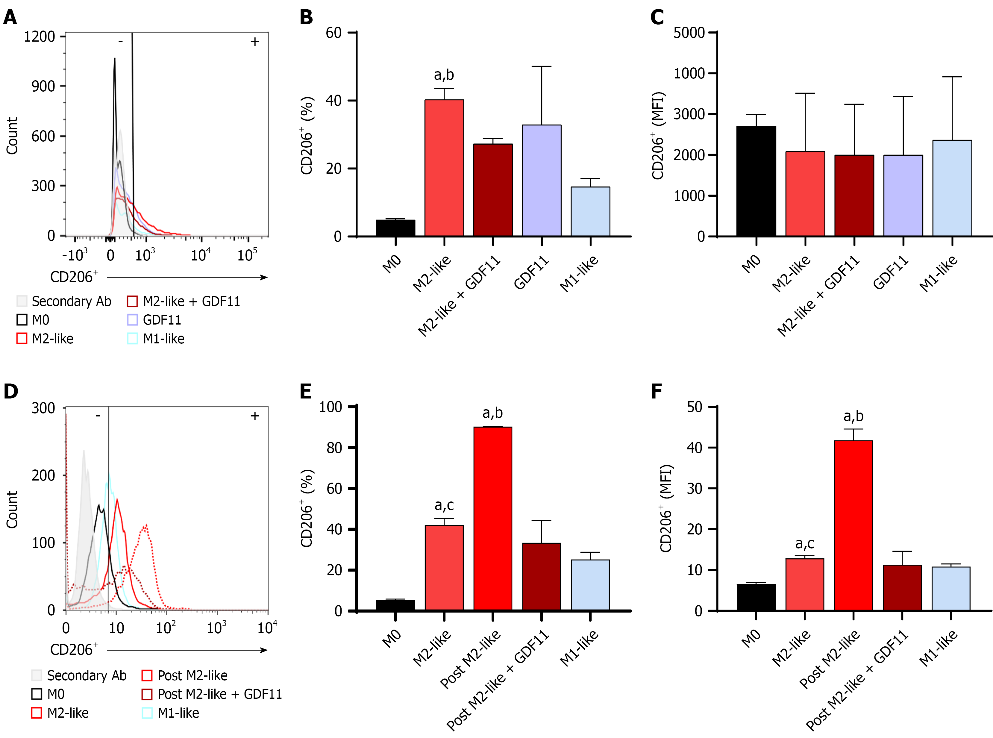 FCM analysis was performed to evaluate cluster of differentiation 206 (CD206) expression. Cells were treated with growth differentiation factor 11 for 72 hours, as stated in the materials and methods section. A: Fluorescence histogram; B: Percentage of CD206+ cells; C: Represents the median fluorescence intensity of the subset. Cells were treated with growth differentiation factor 11 for 144 hours, as stated in the materials and methods section; D: Fluorescence histogram; E: Percentage of CD206+ events; F: Mean fluorescent intensity in subset. Each column represents the mean ± SEM of at least three independent experiments. aP ≤ 0.01 vs M0; bP ≤ 0.05 vs post M2-like + growth differentiation factor 11; cP ≤ 0.001 vs post M2-like. CD206: Cluster of differentiation 206; GDF11: Growth differentiation factor 11; MFI: Mean fluorescent intensity.
