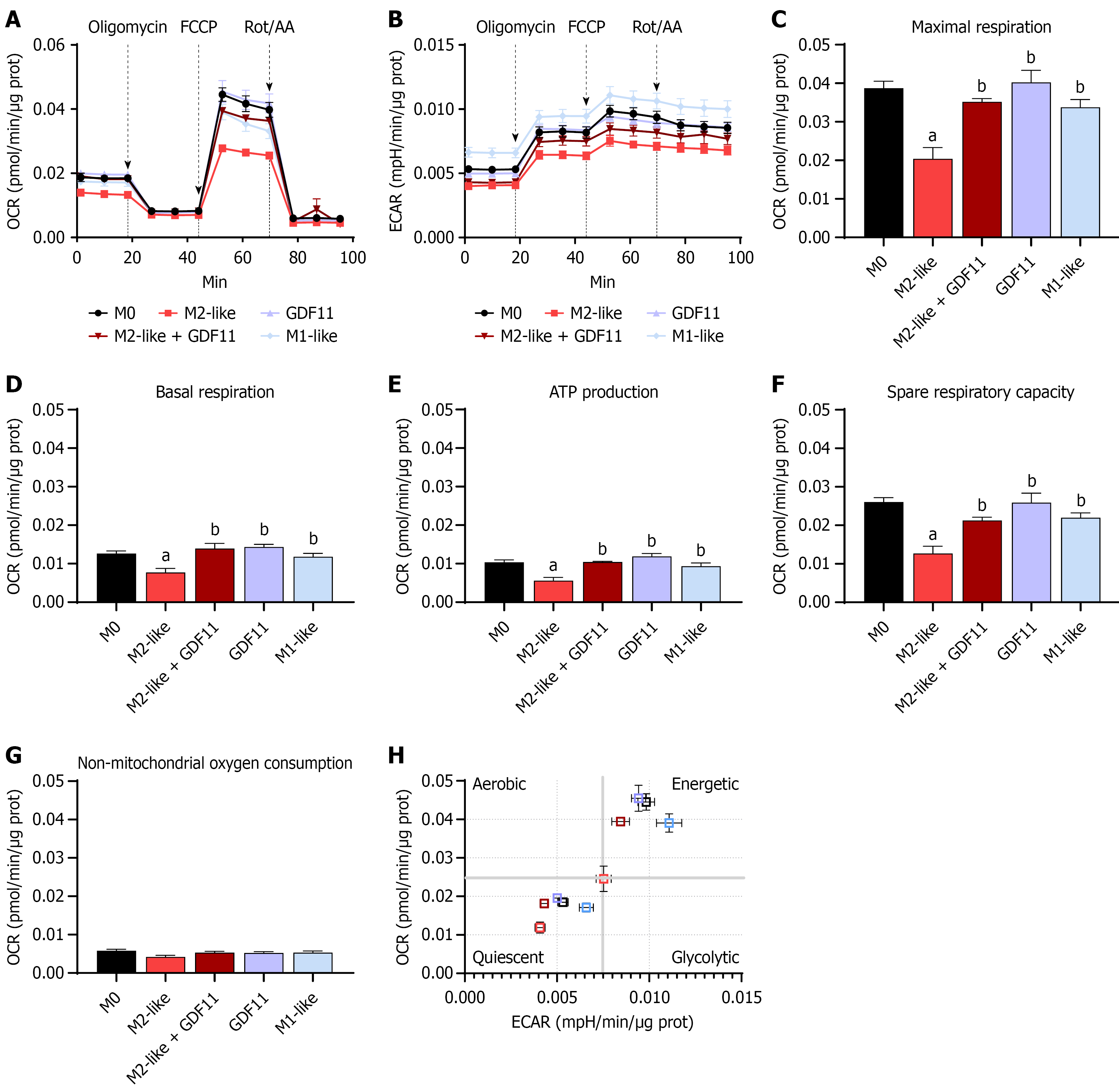 Mitochondrial stress test was performed to determine. A: Oxygen consumption rate; B: Extracellular acidification rates using Seahorse XF24e flux analyzer; C: Maximal respiration; D: Basal respiration; E: Adenosine triphosphate production; F: Spare respiratory capacity; G: Non-mitochondrial oxygen consumption; H: Defective metabolic profile based on relative values of oxygen consumption rate and extracellular acidification rate before and after metabolic inducing stress. Each column represents the mean ± SEM of at least three independent experiments. aP ≤ 0.05 vs M0; bP ≤ 0.05 vs M2-like. OCR: Oxygen consumption rate; ECAR: Extracellular acidification rate; GDF11: Growth differentiation factor 11; ATP: Adenosine triphosphate.