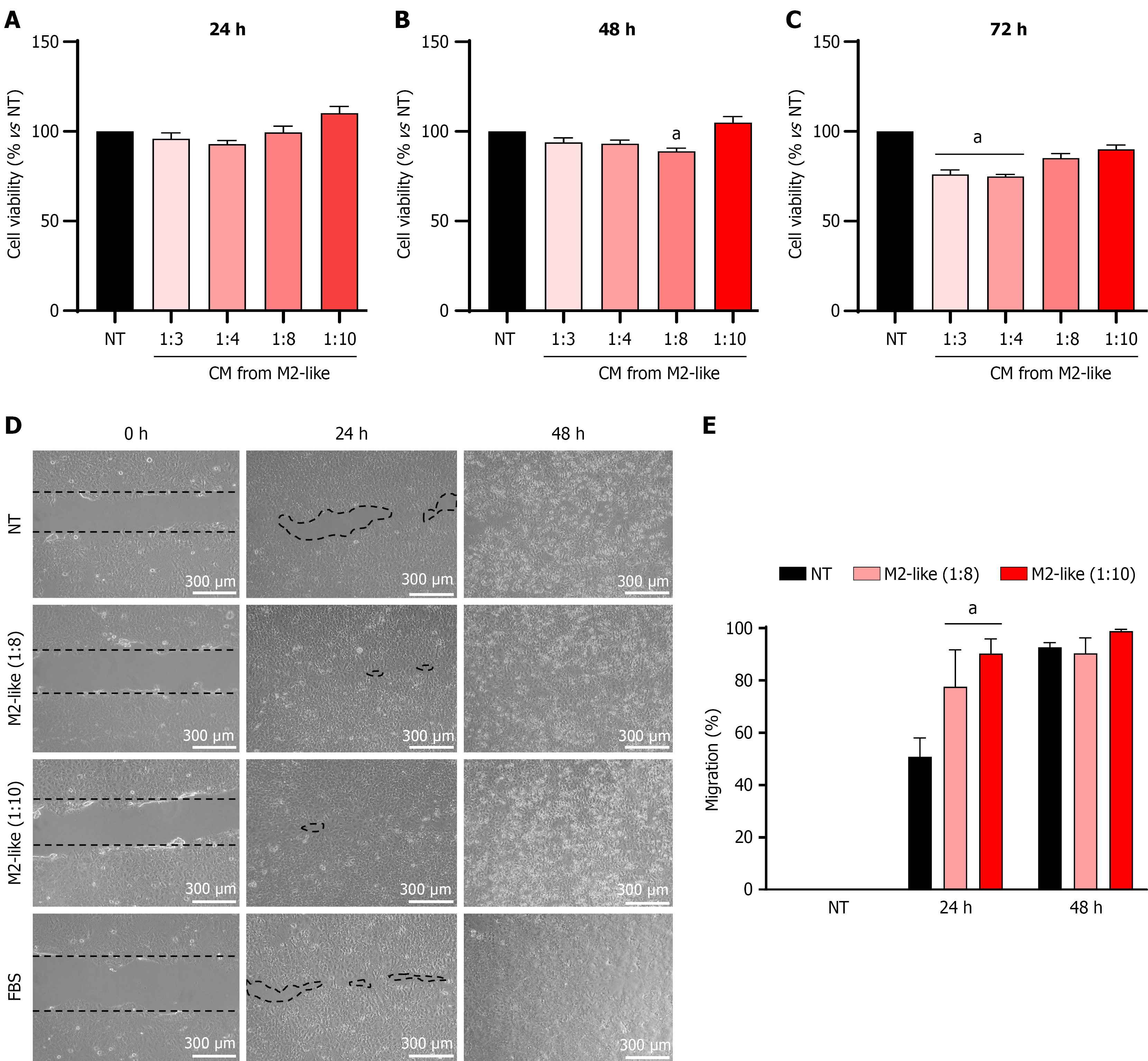 A-C: Cell viability was assessed using the Cell Counting Kit-8 kit (24 hours, 48 hours, and 72 hours, respectively), conditioned media from macrophages at different dilutions were used; D: Cell migration assay determined by a wound healing assay, representative images of at least three independent experiments. Scale bars: 300 μm (100 ×, original magnification); E: Plot of the percentage of migration determined by Image J software. Each column represents the mean ± SEM of at least three independent experiments in triplicate. aP ≤ 0.05 vs not treated cells. NT: Not treated cells; CM: Conditioned media; FBS: Fetal bovine serum.